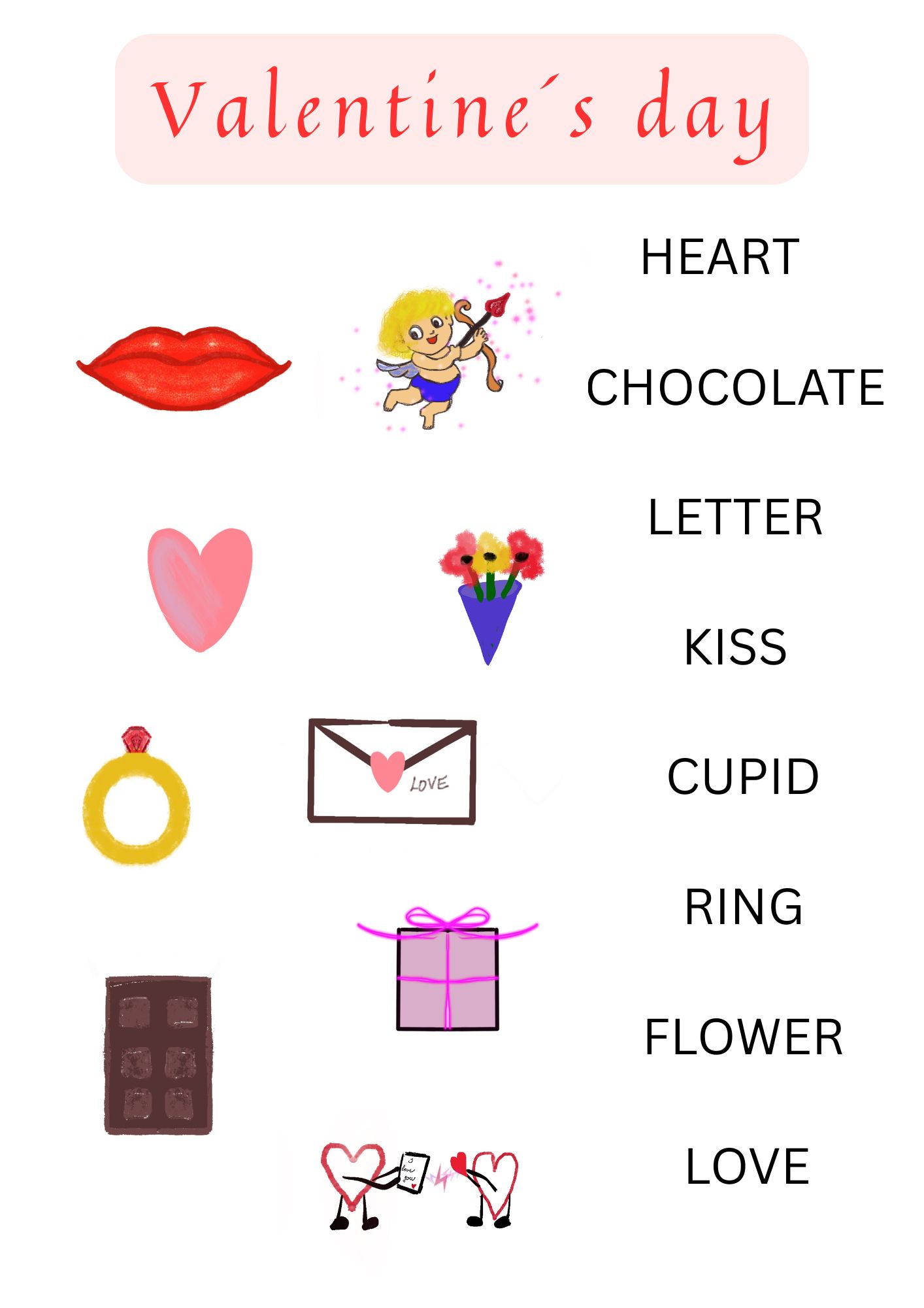 Valentýnská tematika v angličtině s procvičením základních předškolních dovedností.