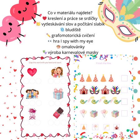 Hravý tematický balíček, který propojuje Valentýna a Karneval v zábavných aktivitách pro děti v mateřské škole. Ideální pro únorové tvoření, centra aktivit nebo klidové činnosti.