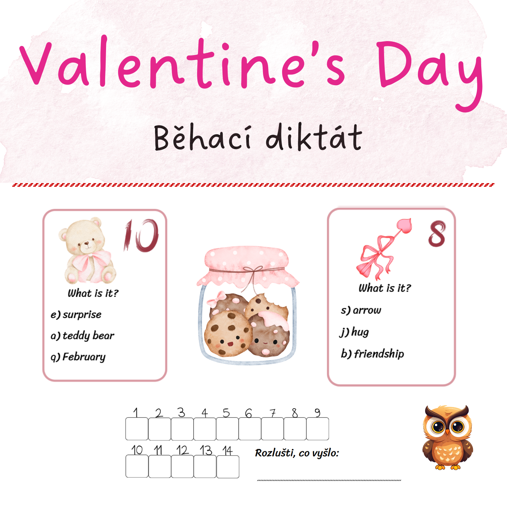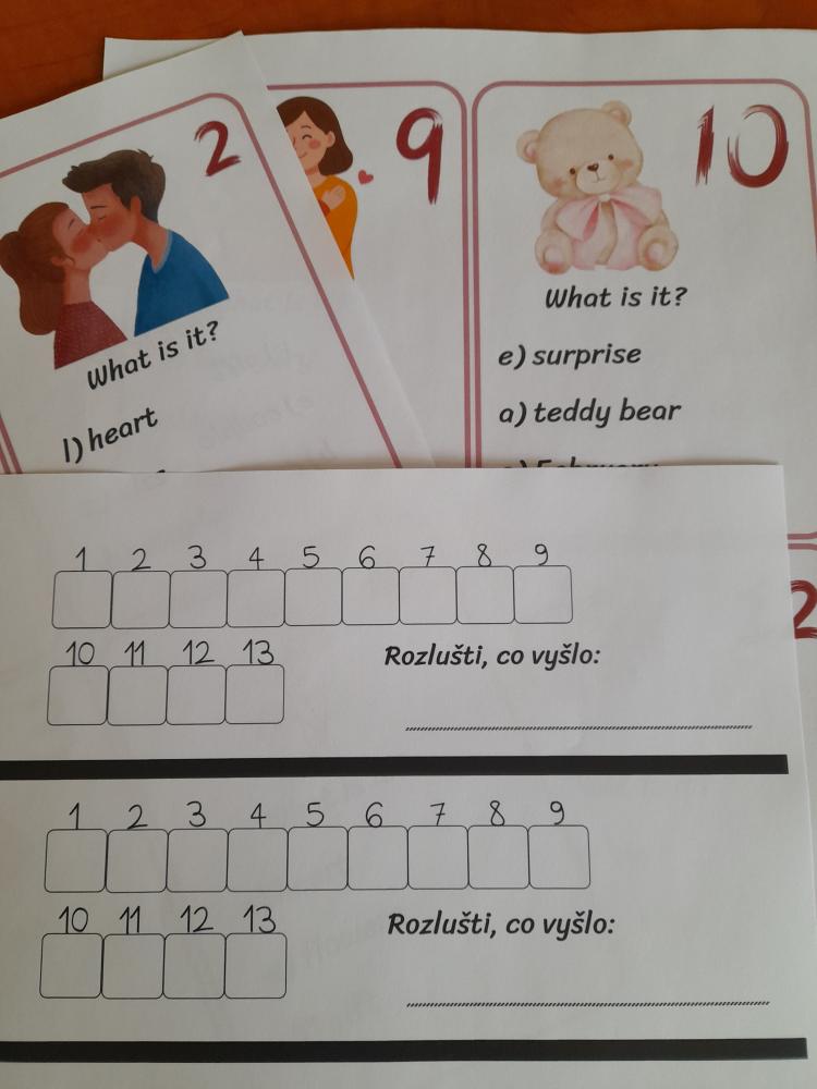 Běhací diktát na téma Valentyne´s day, včetně záznamového archu. Aktivita je vhodná pro výuku angličtiny, rozvíjí slovní zásobu, čtení, psaní i pohyb.