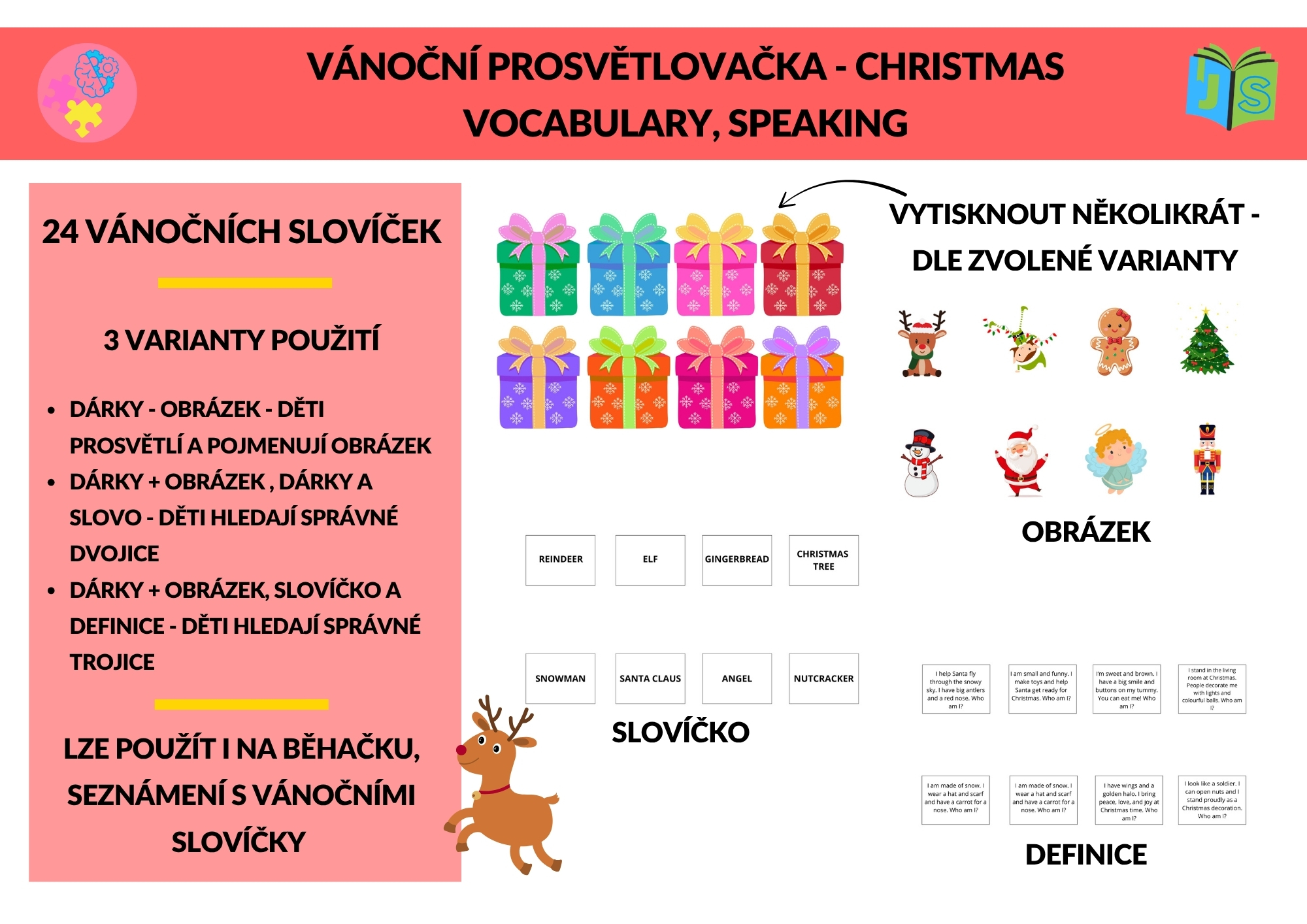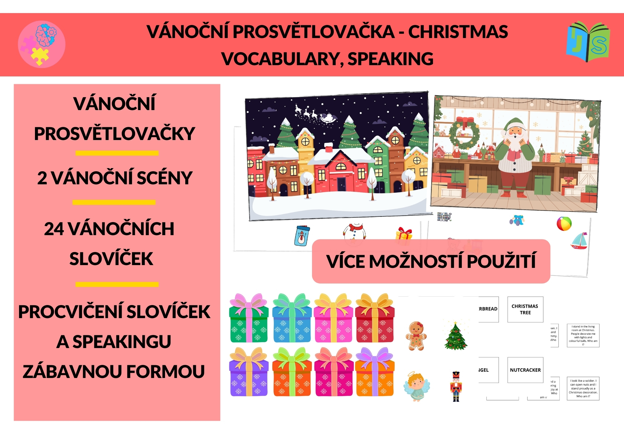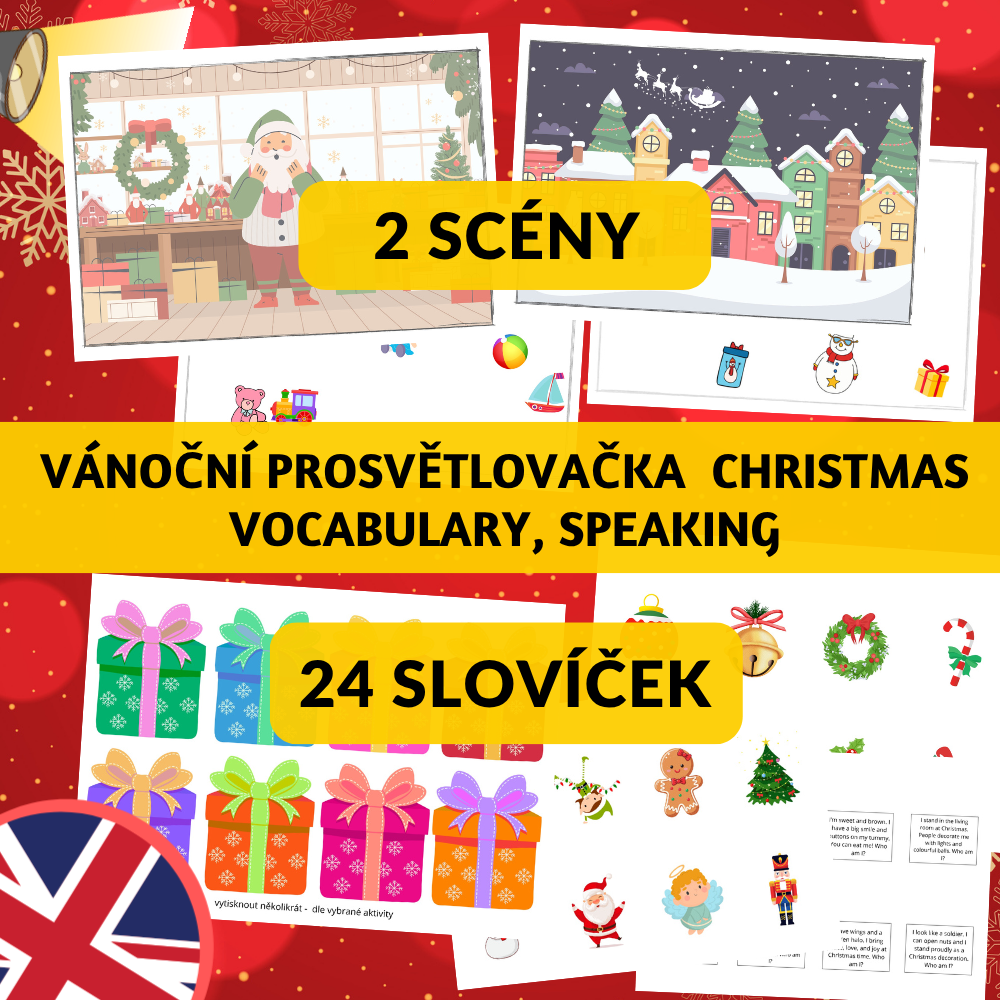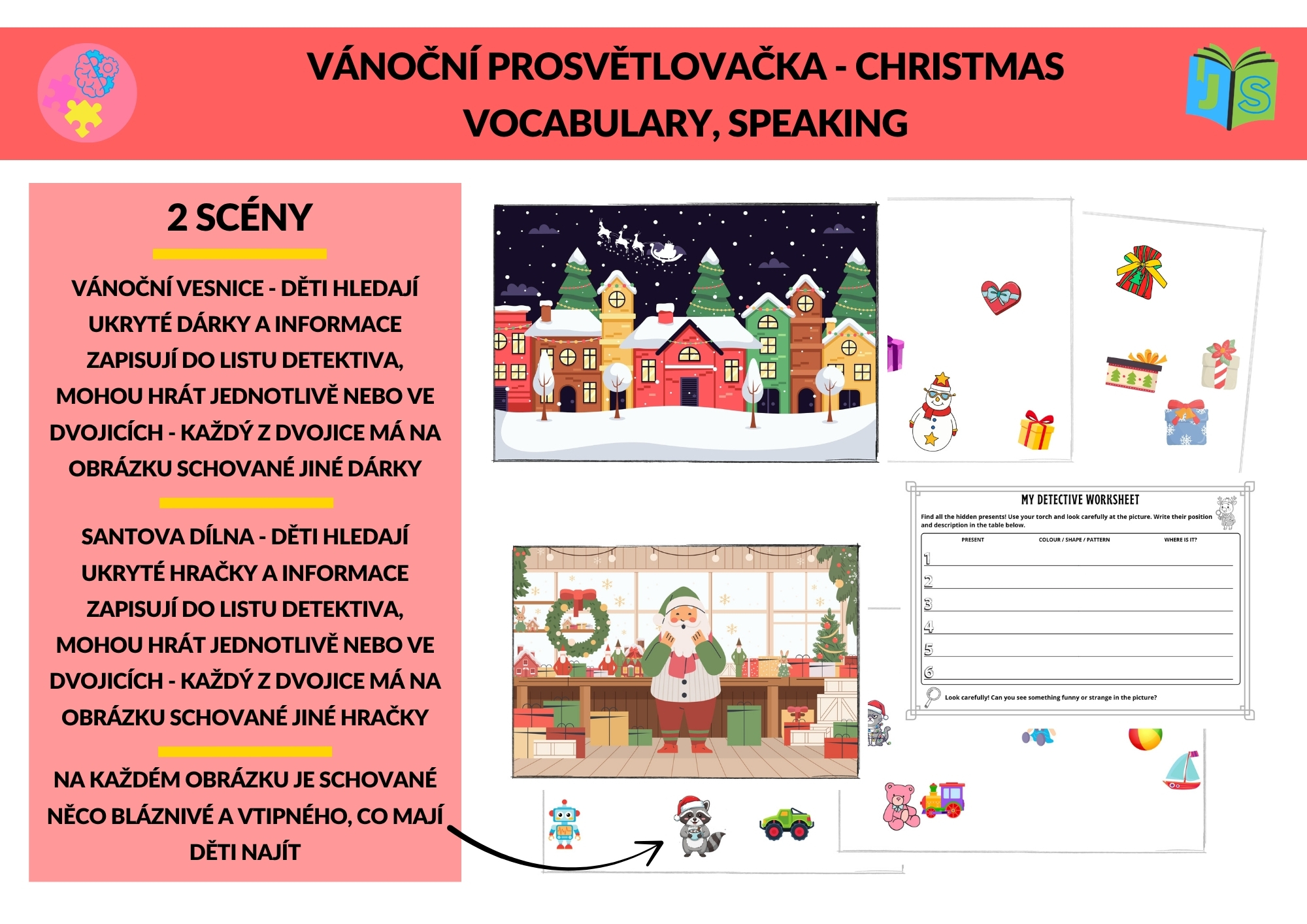 Vánoční prosvětlovačka – Christmas Vocabulary & Speaking je originální a hravá aktivita pro výuku angličtiny s vánoční tematikou. Materiál obsahuje dvě ilustrované scény (zimní vesnice a Santova dílna), ve kterých děti pomocí baterky odhalují skryté dárky či hračky a zapisují své objevy do pracovního listu My Detective Worksheet.