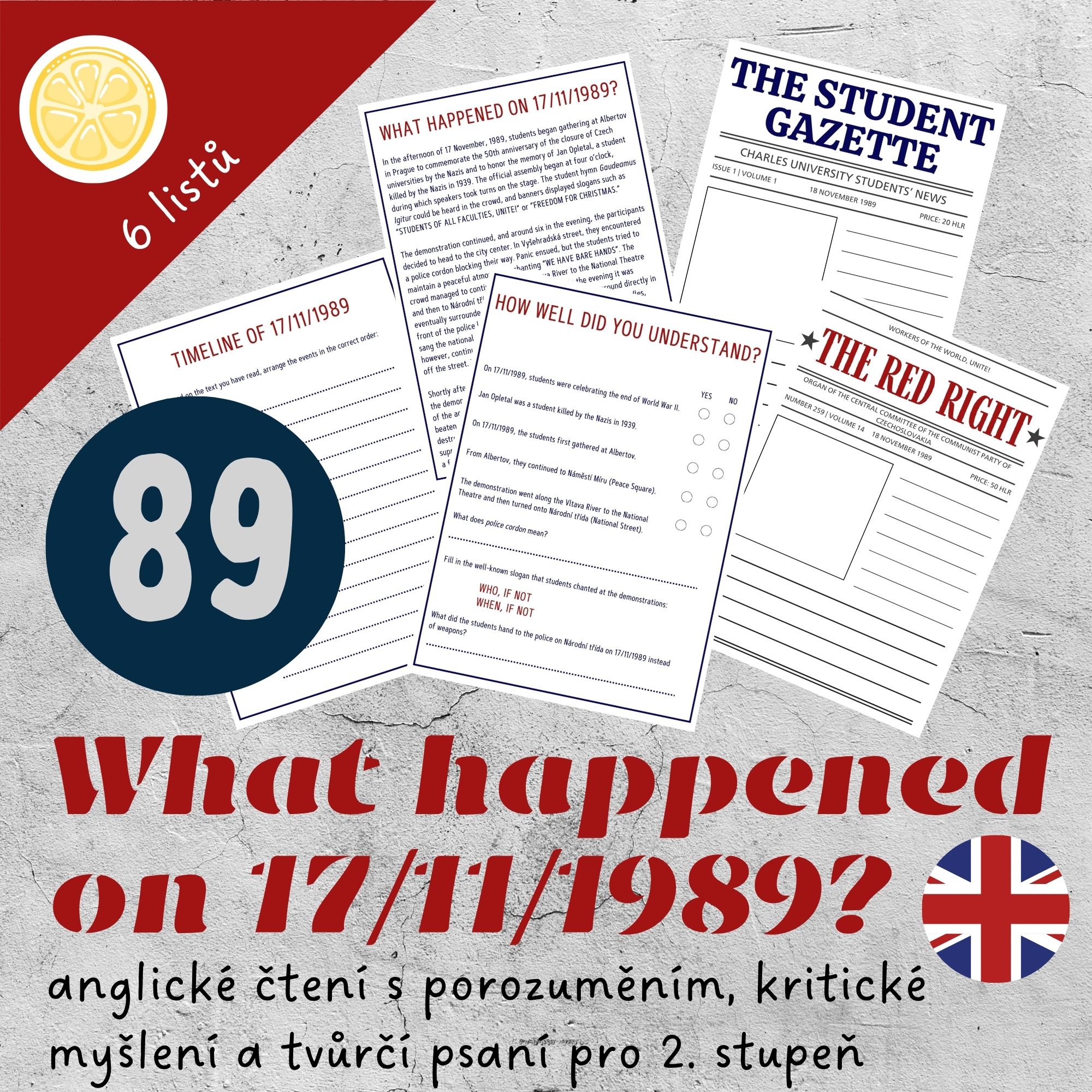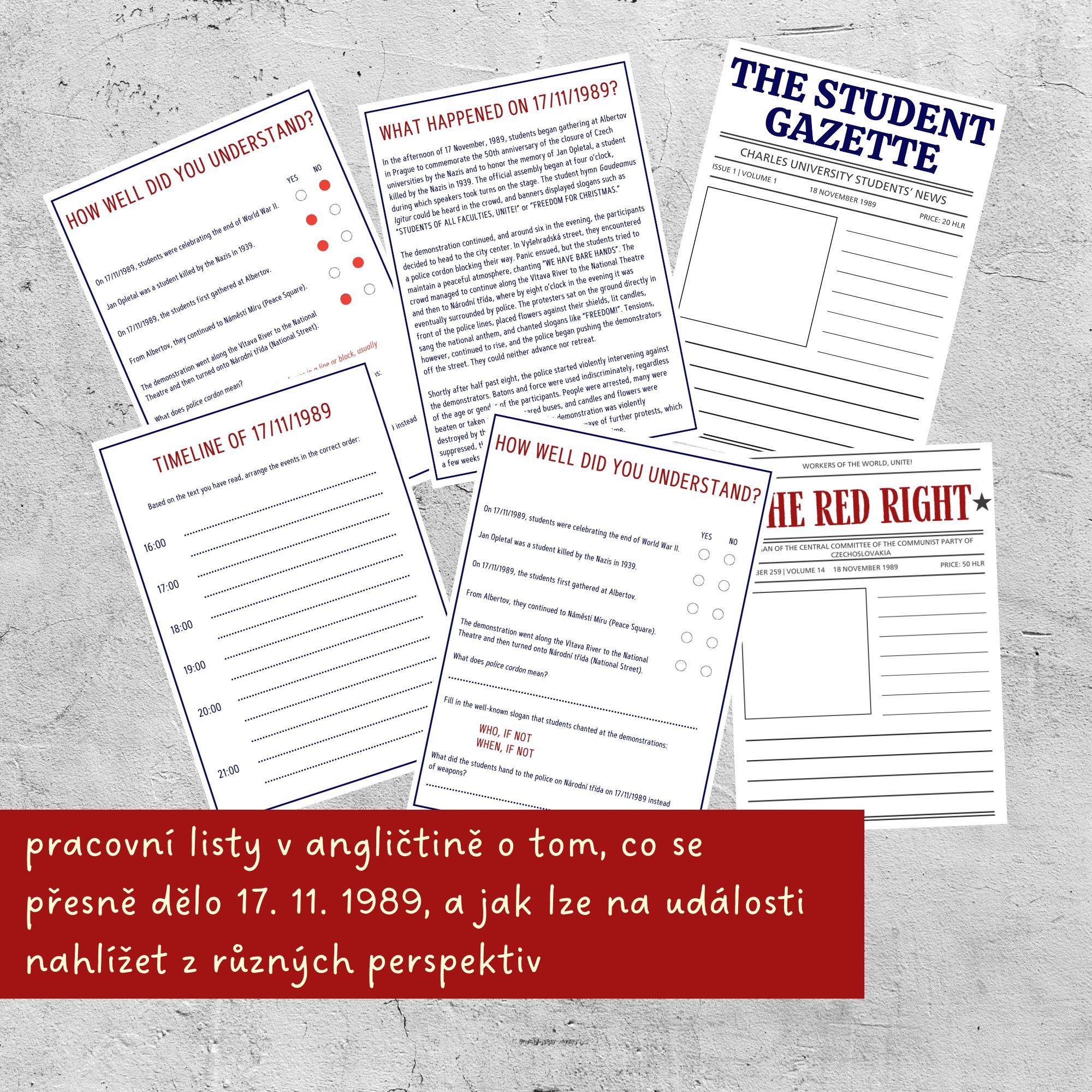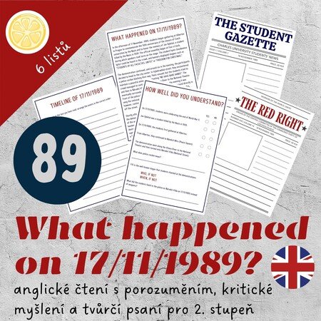 🔴Pracovní listy v angličtině jsou věnované přímo dění dne 17. listopadu 1989. Žáci si nejprve přečtou text o průběhu demonstrace, která se z klidného shromáždění změnila v násilný střet s představiteli moci. Následně odpoví na otázky, které ozkouší jejich pozornost při čtení, a zkusí si sami sestavit časovou osu dění. Pro rychlou kontrolu učitele je arch s otázkami připravený i vyplněný.