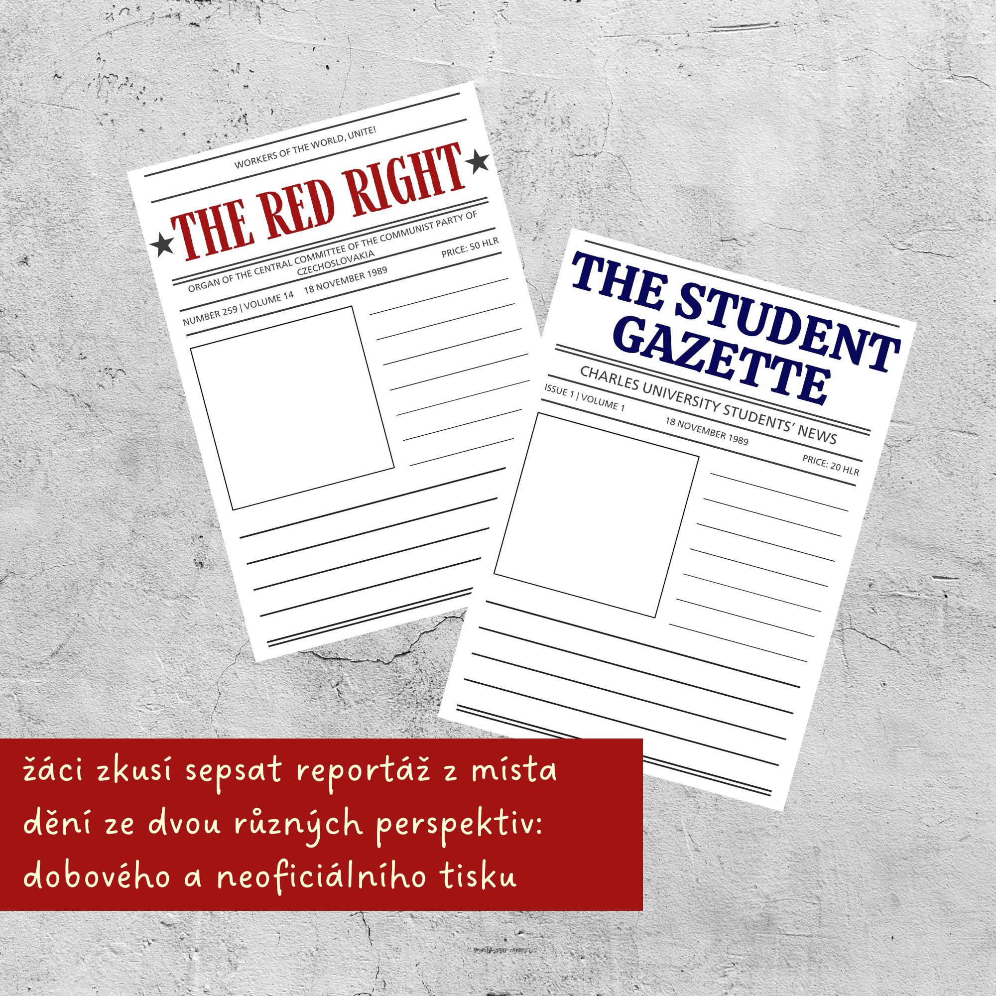 🔴 Dále jsou tu pro žáky připraveny dvě šablony s titulními stranami dobových novin - jedny oficiální a jedny studentské. Žáci mohou zkusit sepsat reportáž z demonstrace ze dvou úhlů pohledu a vyzkoušet si, jak lze s informacemi manipulovat ve prospěch toho, kdo je vypráví.