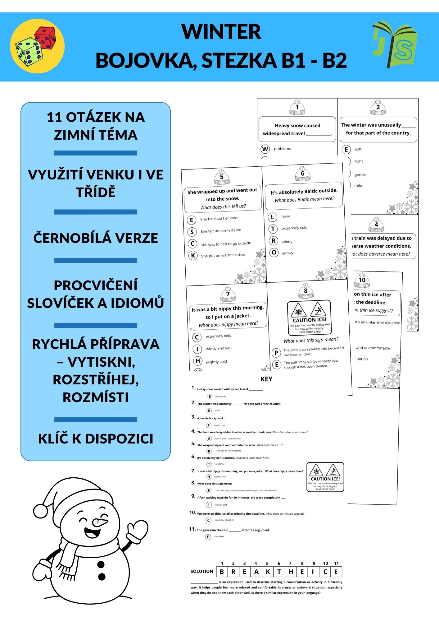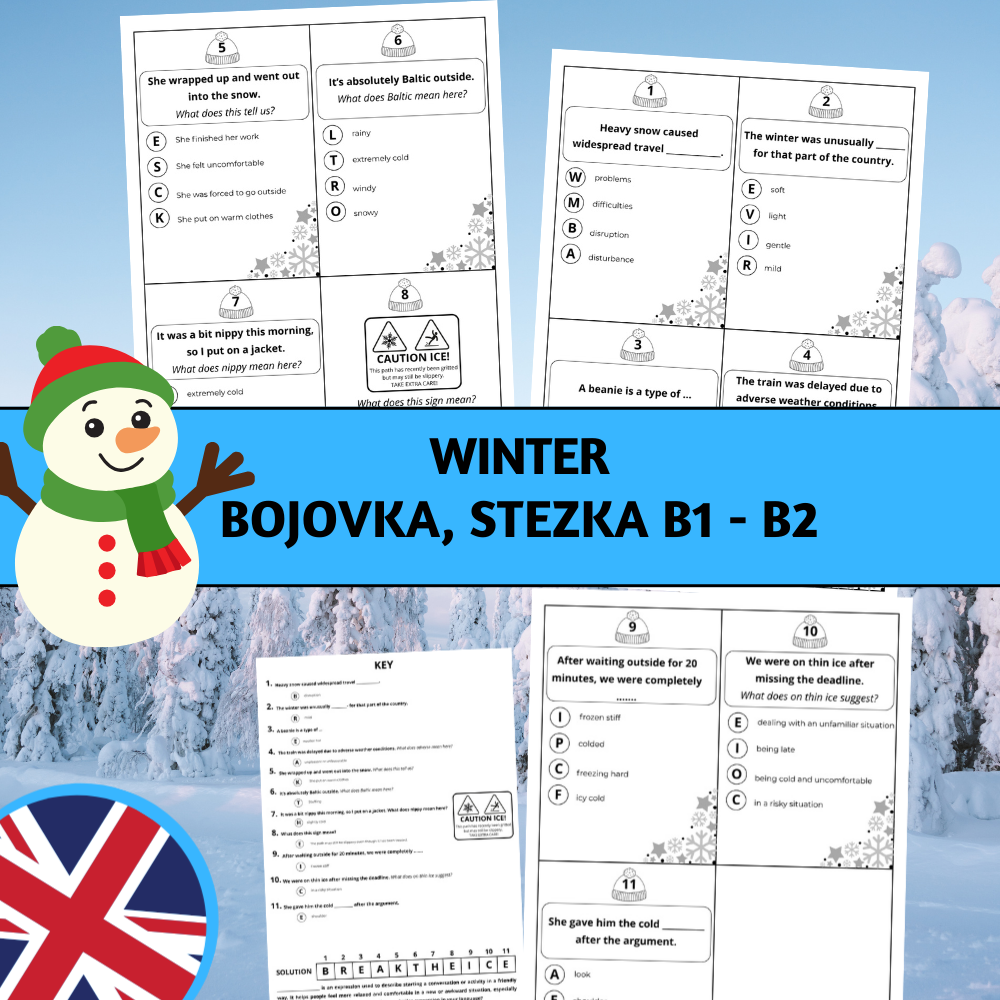 Zábavná zimní bojovka, která rozhýbe žáky a zároveň procvičí slovní zásobu, idiomy a porozumění textu. Žáci postupně řeší otázky na zimní téma, sbírají písmena a na závěr vyluští tajenku – známý idiom “break the ice”.