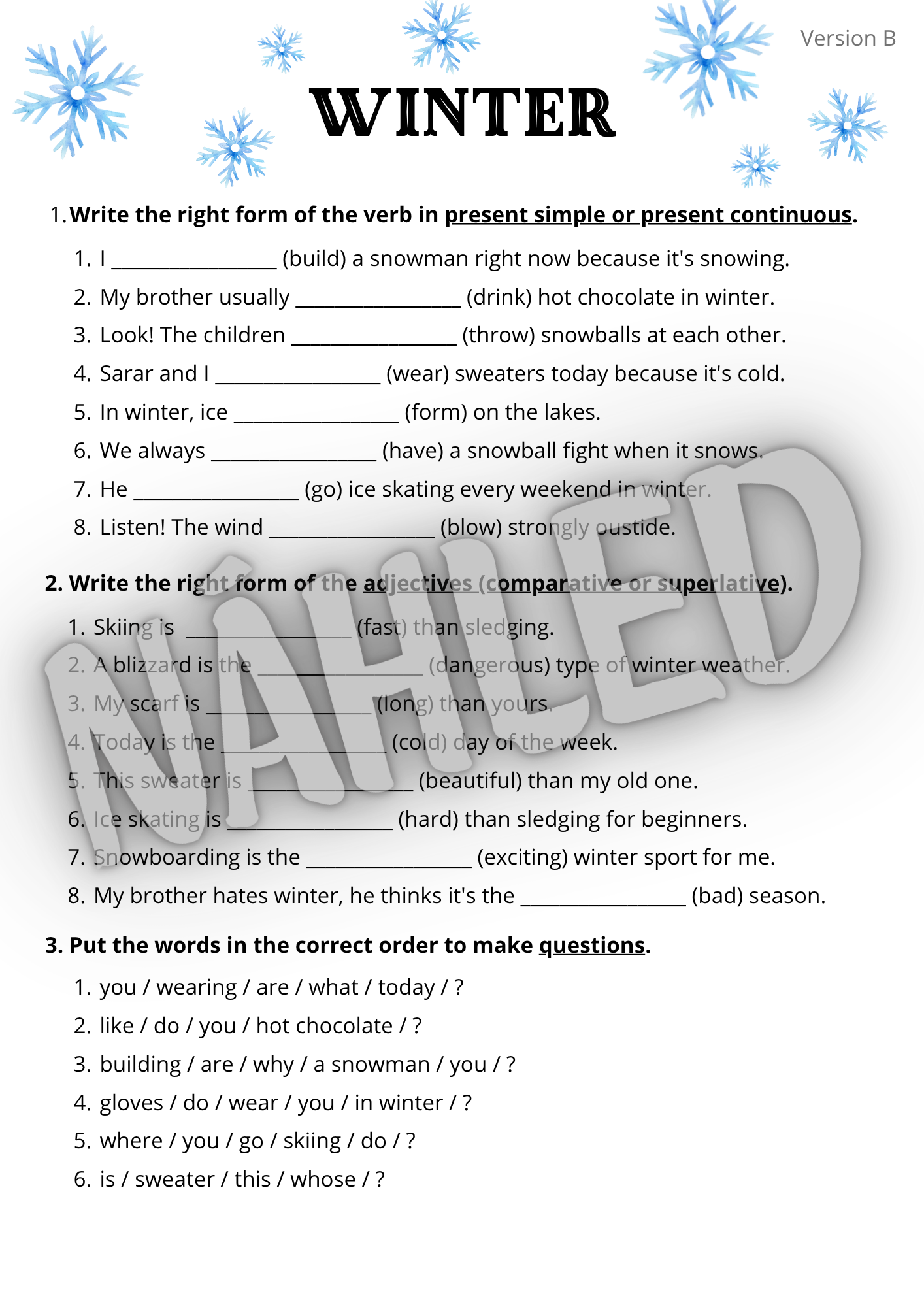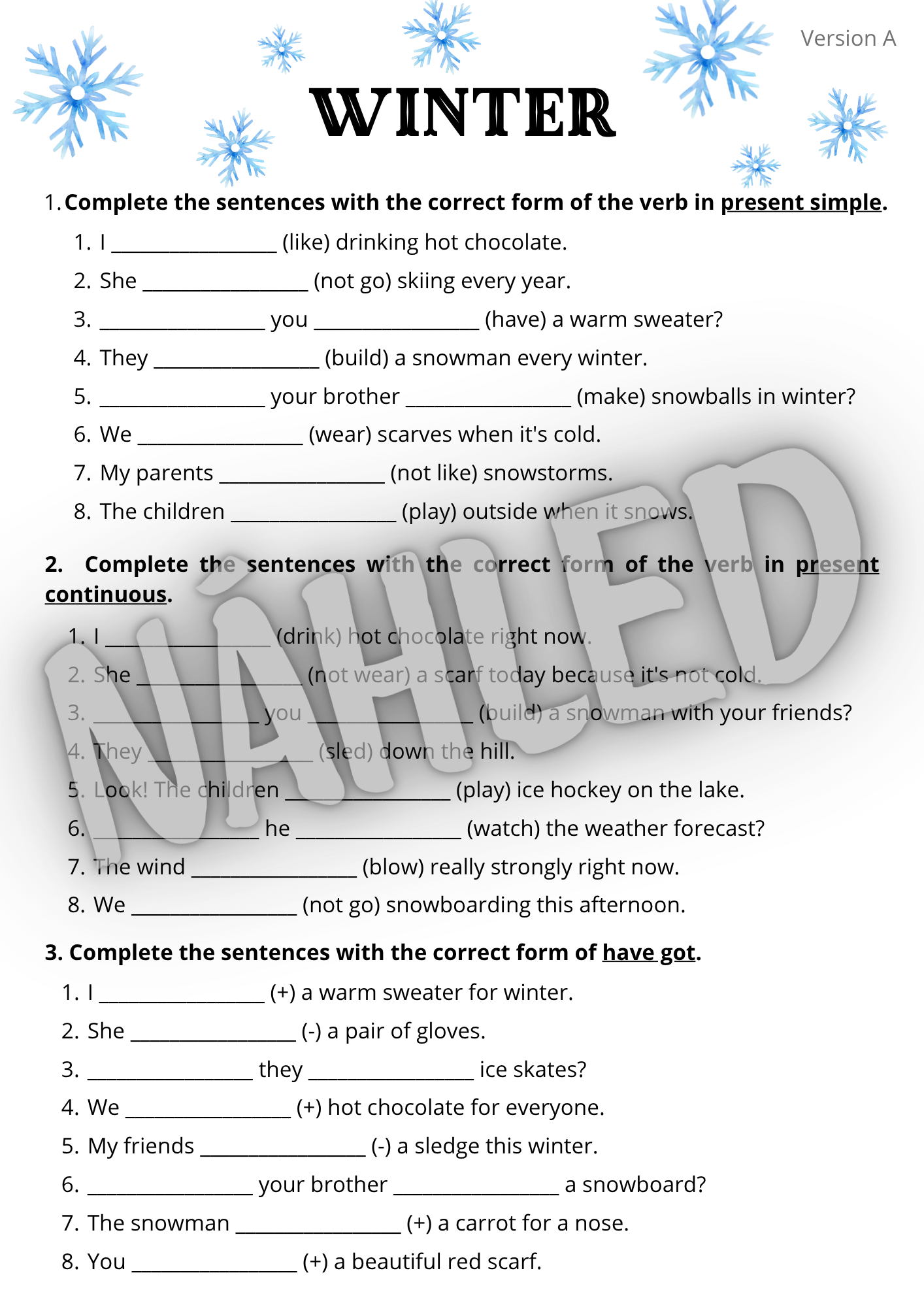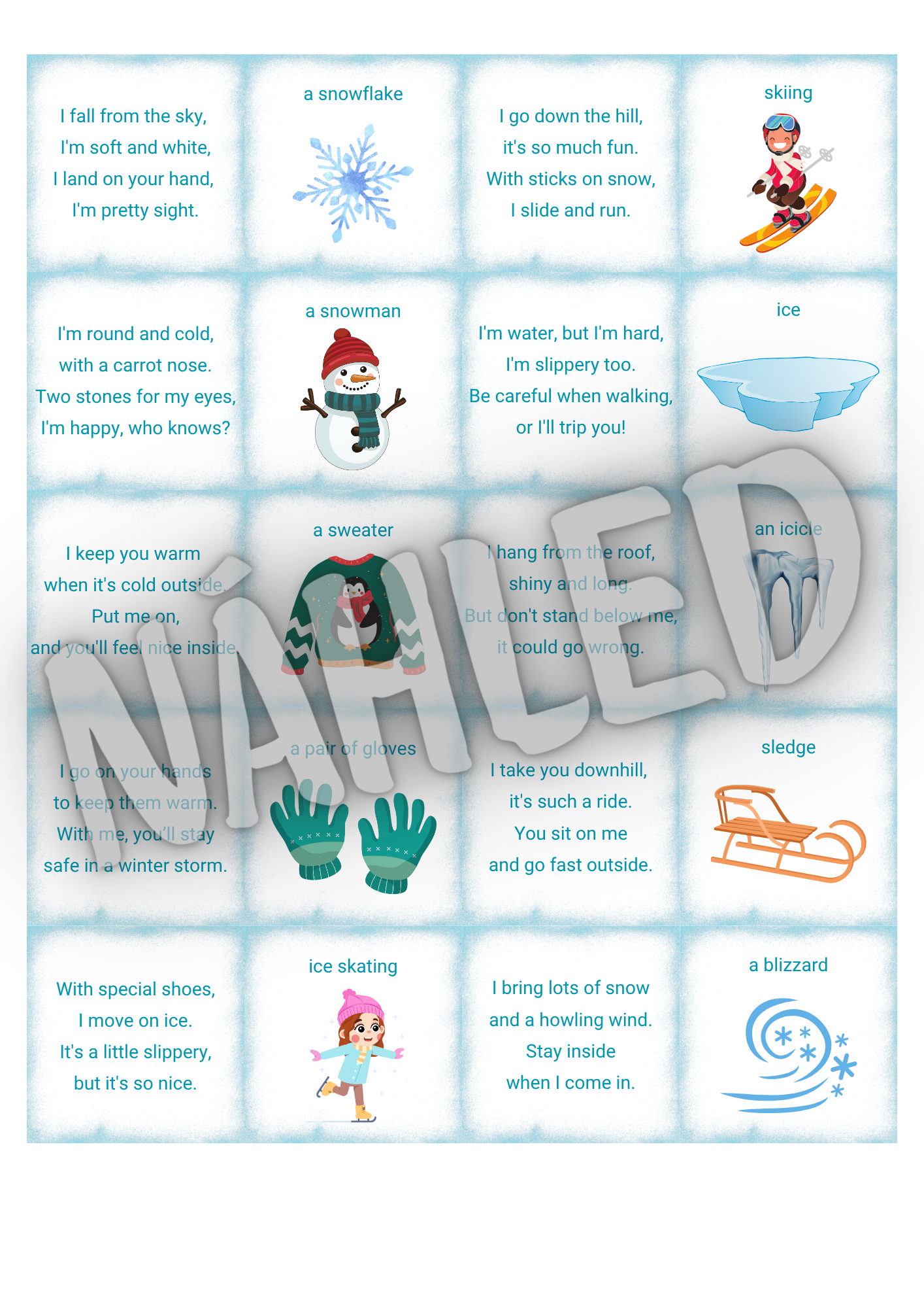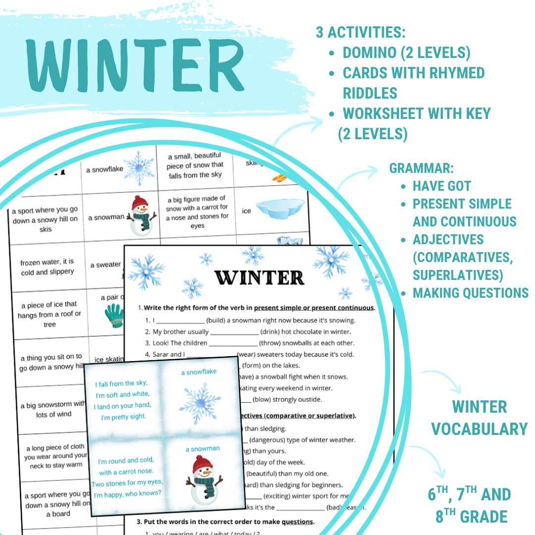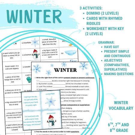 Set 3 aktivit, které slouží k procvičení a rozvoji slovní zásoby na téma zima a na procvičení gramatiky. Materiál obsahuje 2 verze domina (lehčí, těžší), kartičky s rýmovanými hádankami a 2 verze pracovních listů (lehčí, těžší).