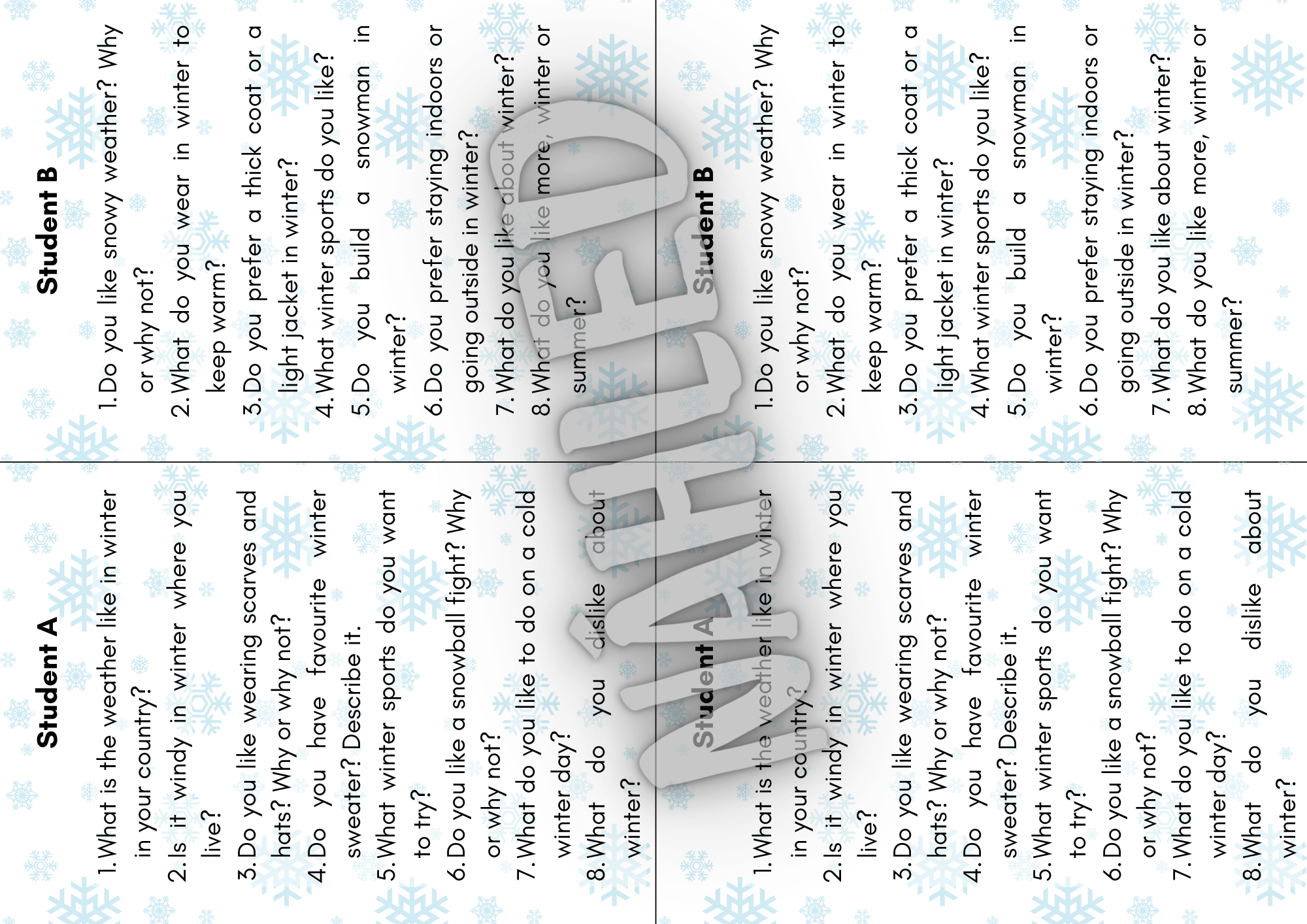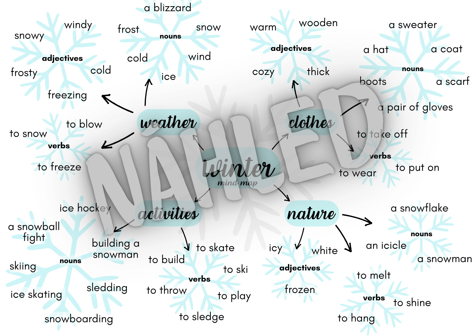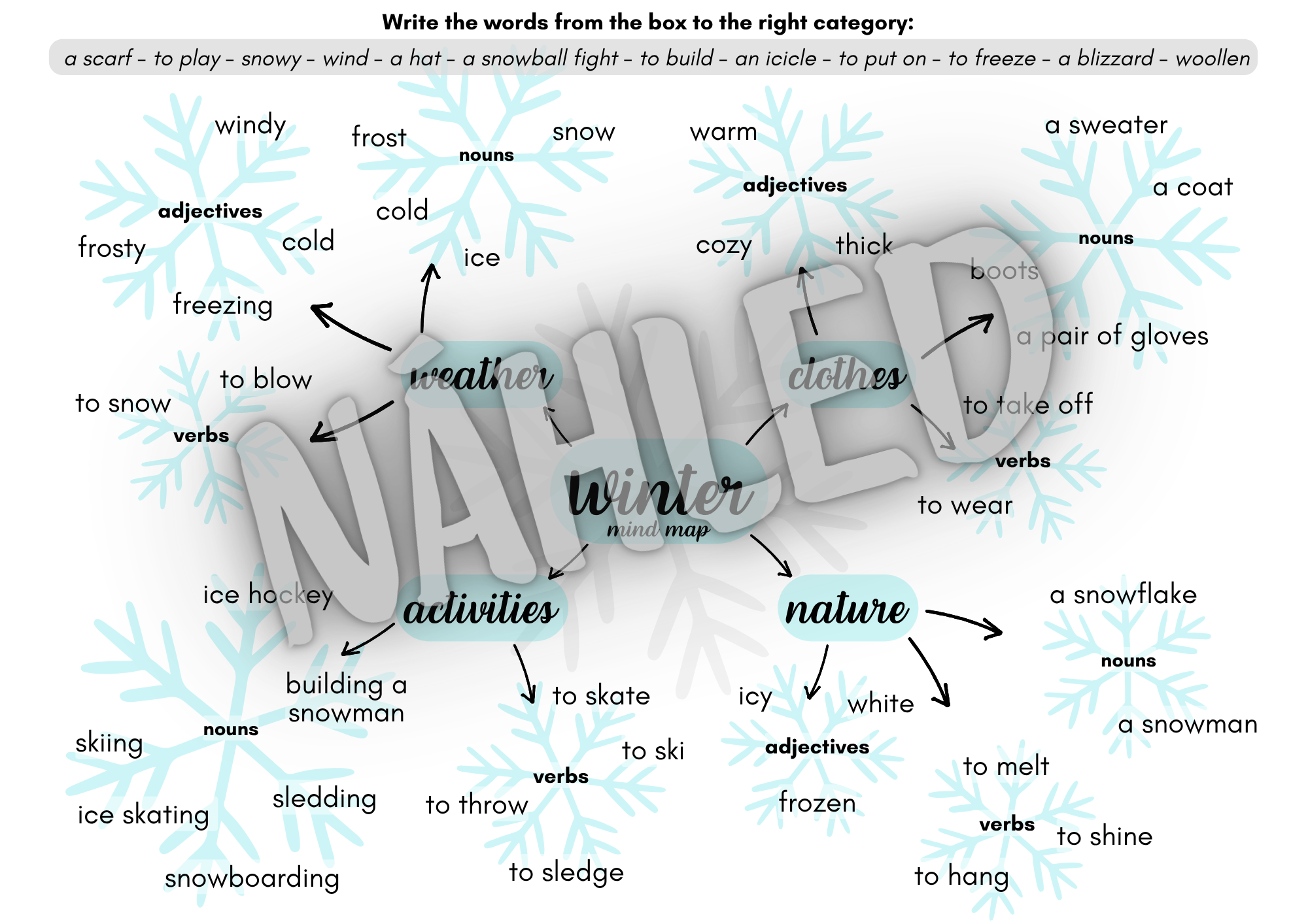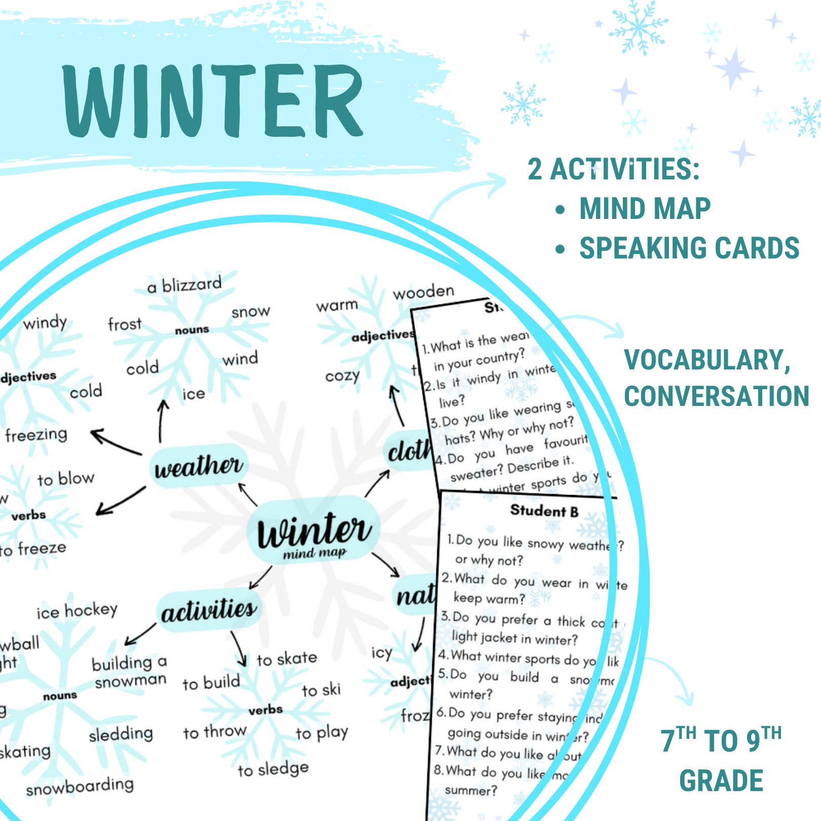 Aktivity zaměřené na procvičení slovní zásoby a mluvení na téma zima. Materiál obsahuje myšlenkovou mapu a konverzační karty.