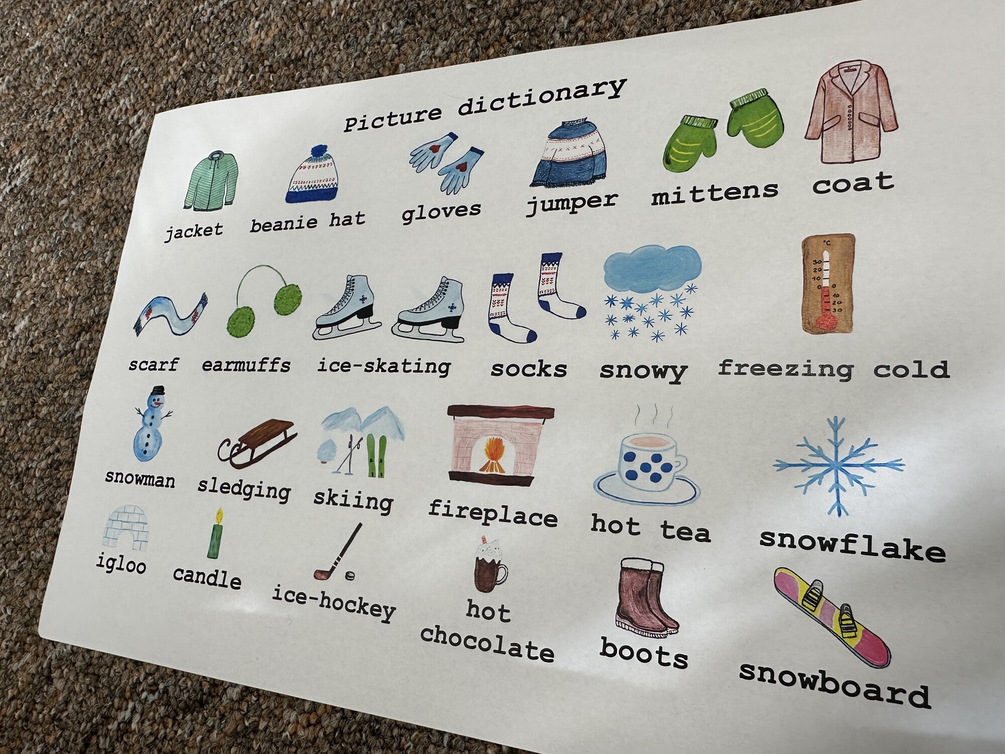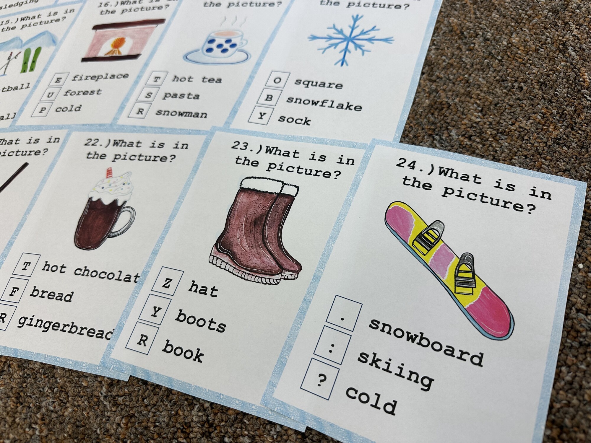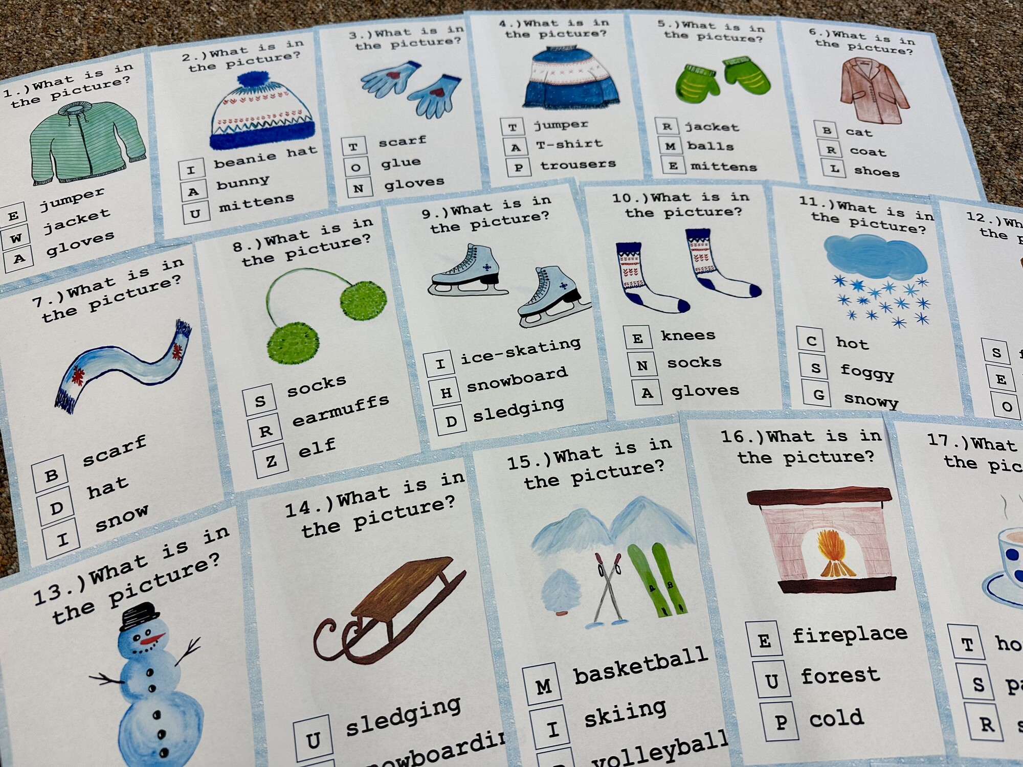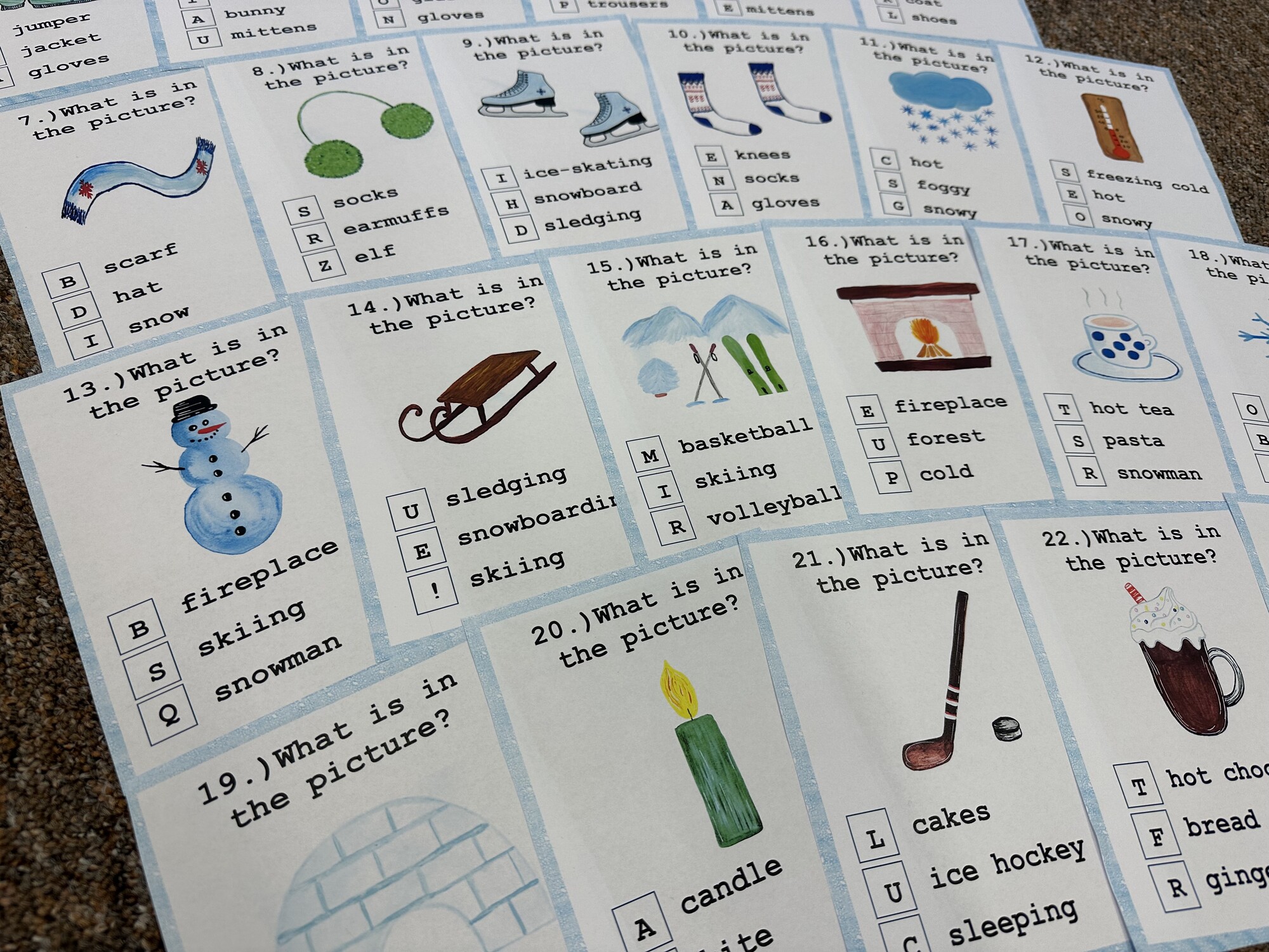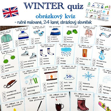 Materiál obsahuje 14 A4 stran – 24 karet s otázkami, list k zápisu odpovědí, obrázkový slovníček. Ručně malované obrázky, bez použití Canvy a AI.