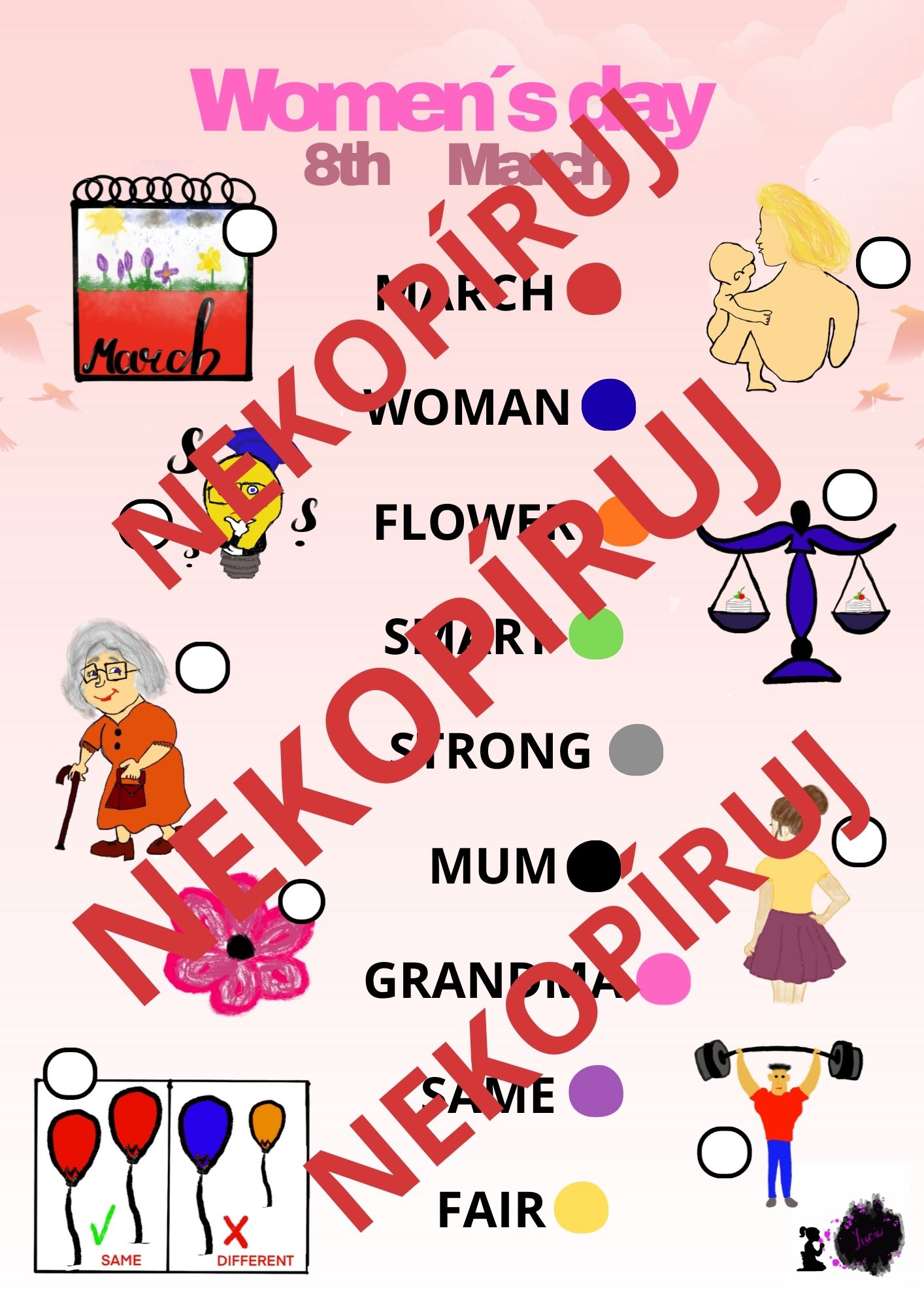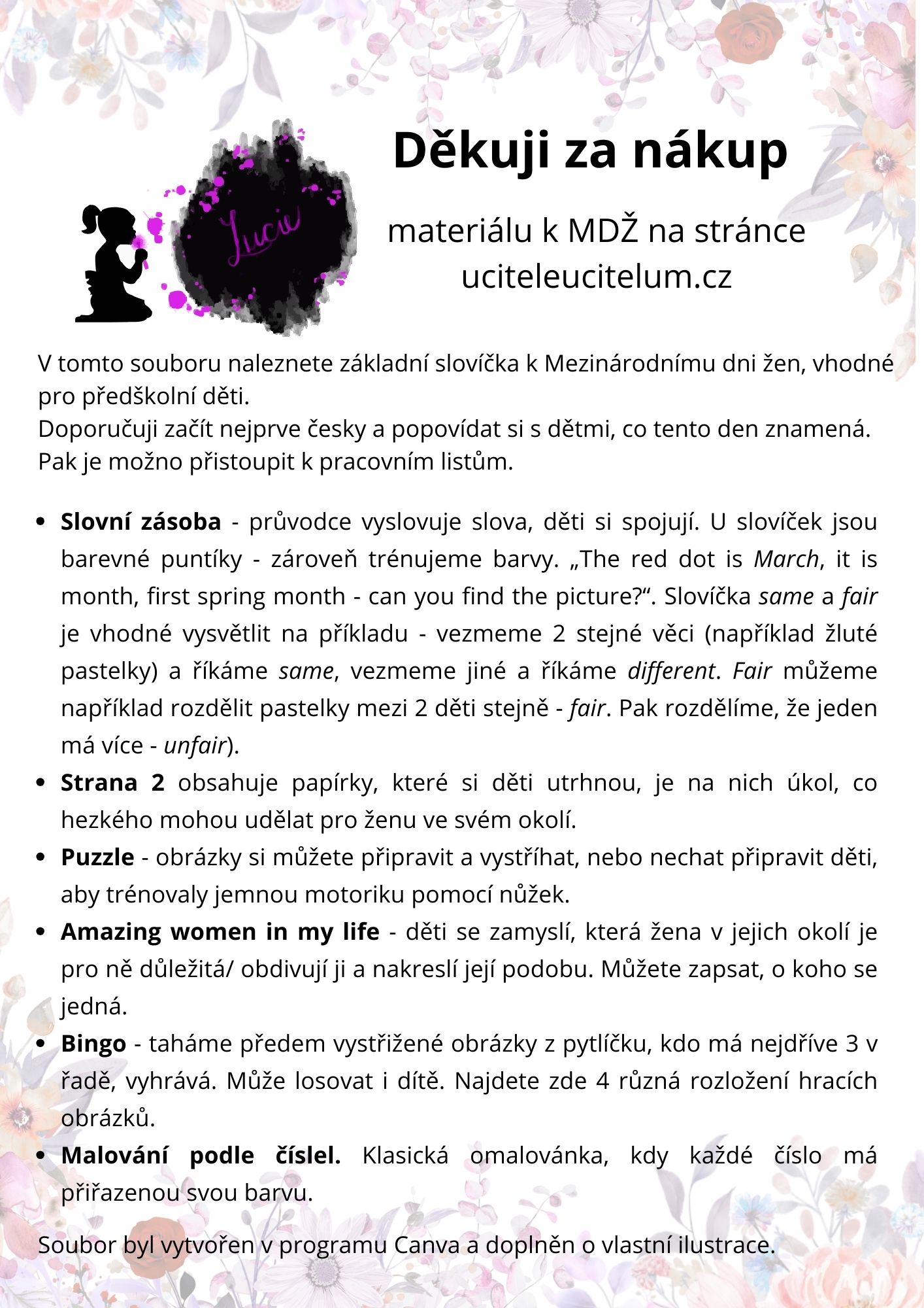 Najdete zde: slovní zásobu k tématu, jednoduché puzzle, zamyšlení o důležitých ženách v našem životě, lístečky s drobnostmi, které někomu v okolí zlepší den, hru bingo a jednoduchou omalovánku podle čísel.