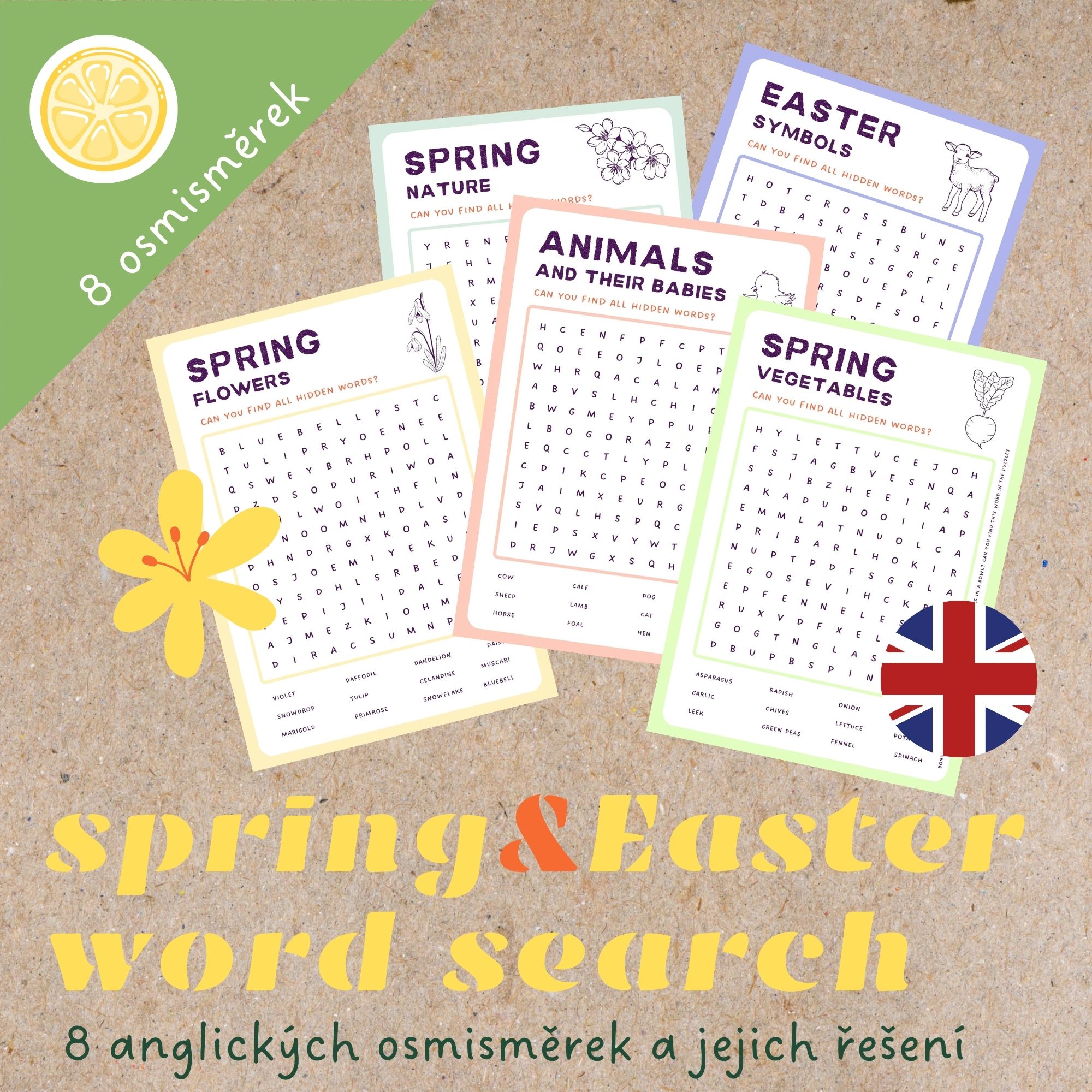 🐝Sada obsahuje osm anglických osmisměrek a jejich řešení, tematicky zaměřených na jaro a Velikonoce. Děti se hravou formou seznámí s jarními květinami, zeleninou, probouzející se přírodou i velikonočními symboly a významnými dny.