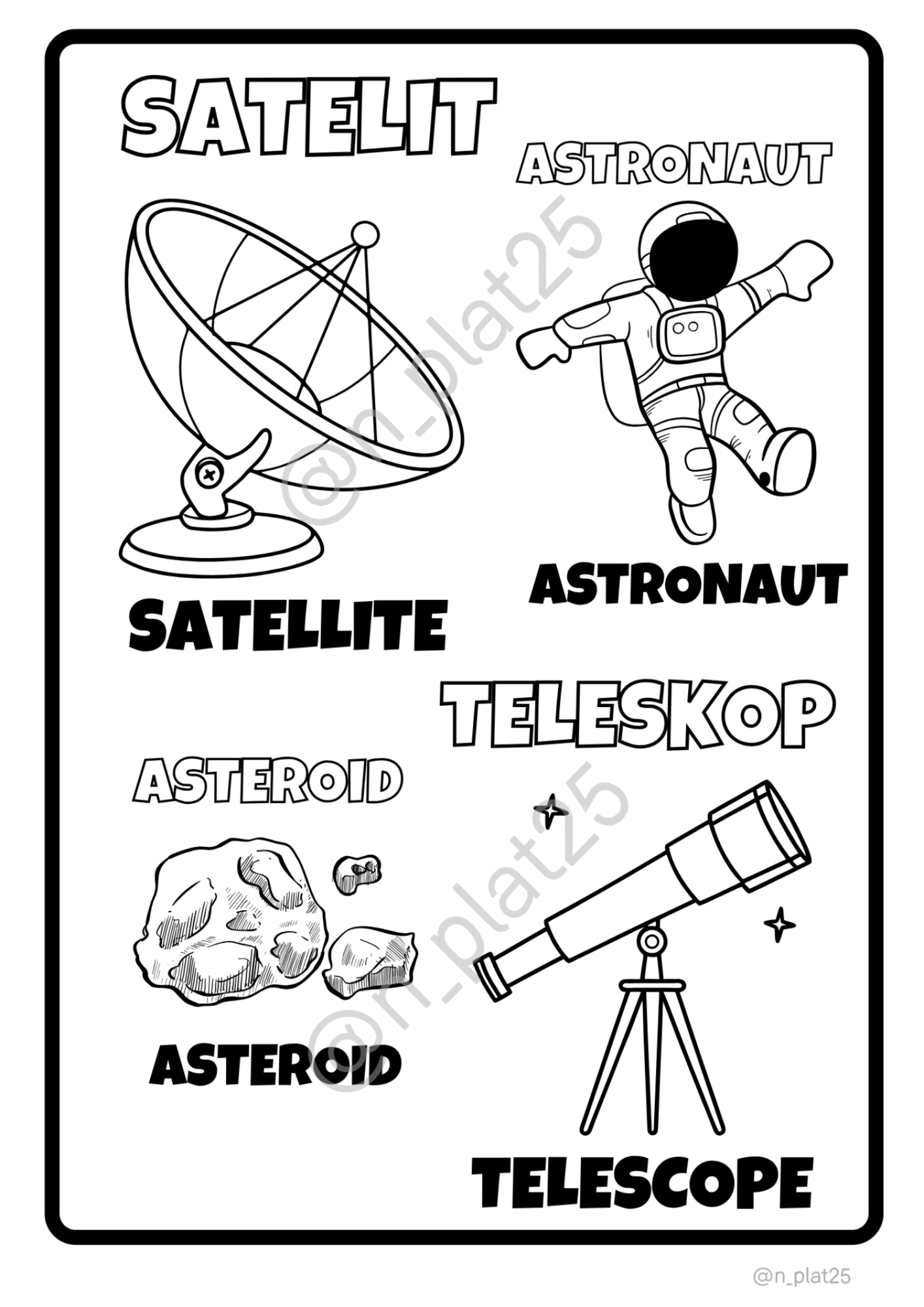 · atraktivní slovní zásobu z oblasti vesmíru v angličtině - možno využít jako demonstrační výukové karty nebo pro žáky, kteří si mohou obrázky vybarvit.