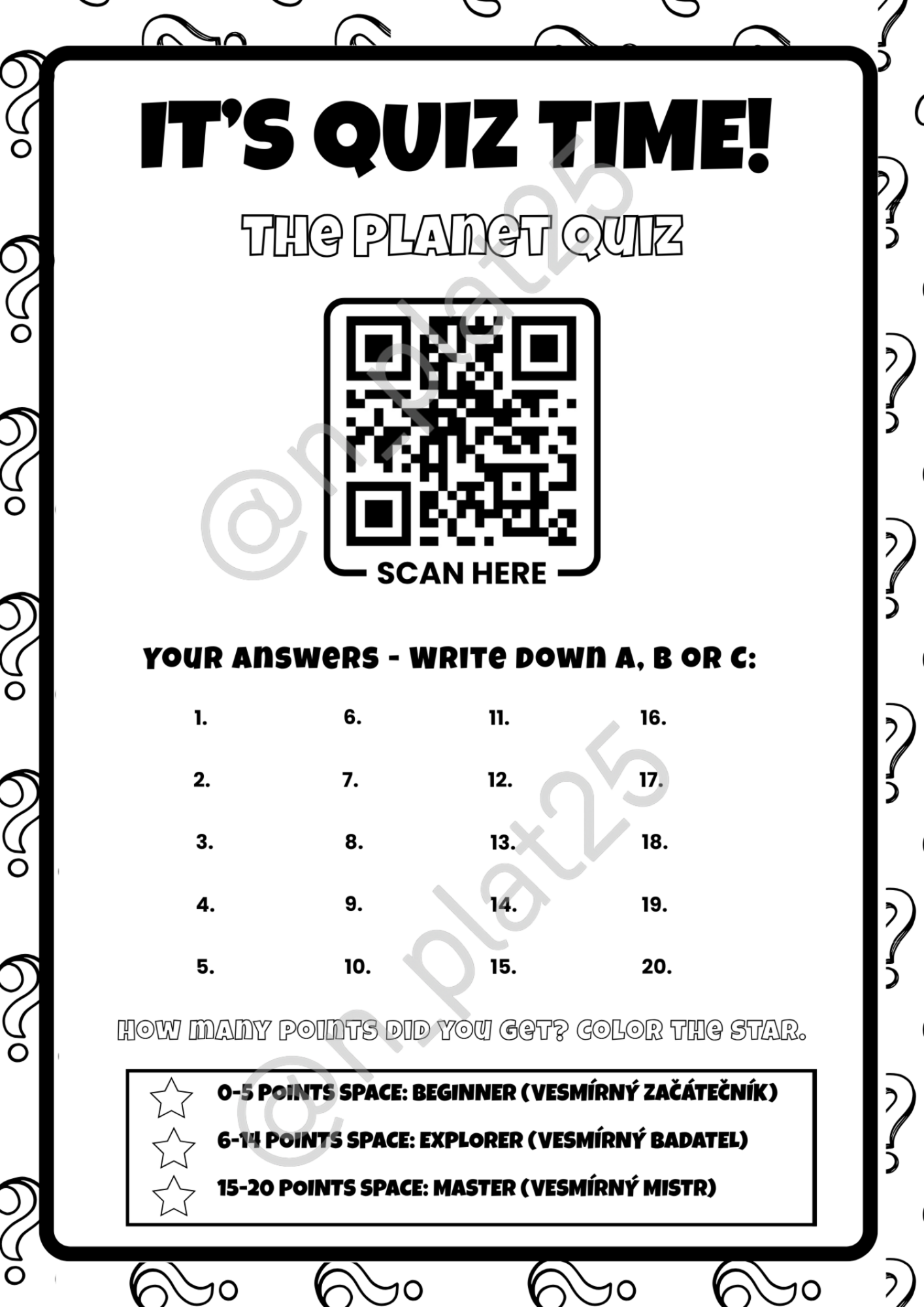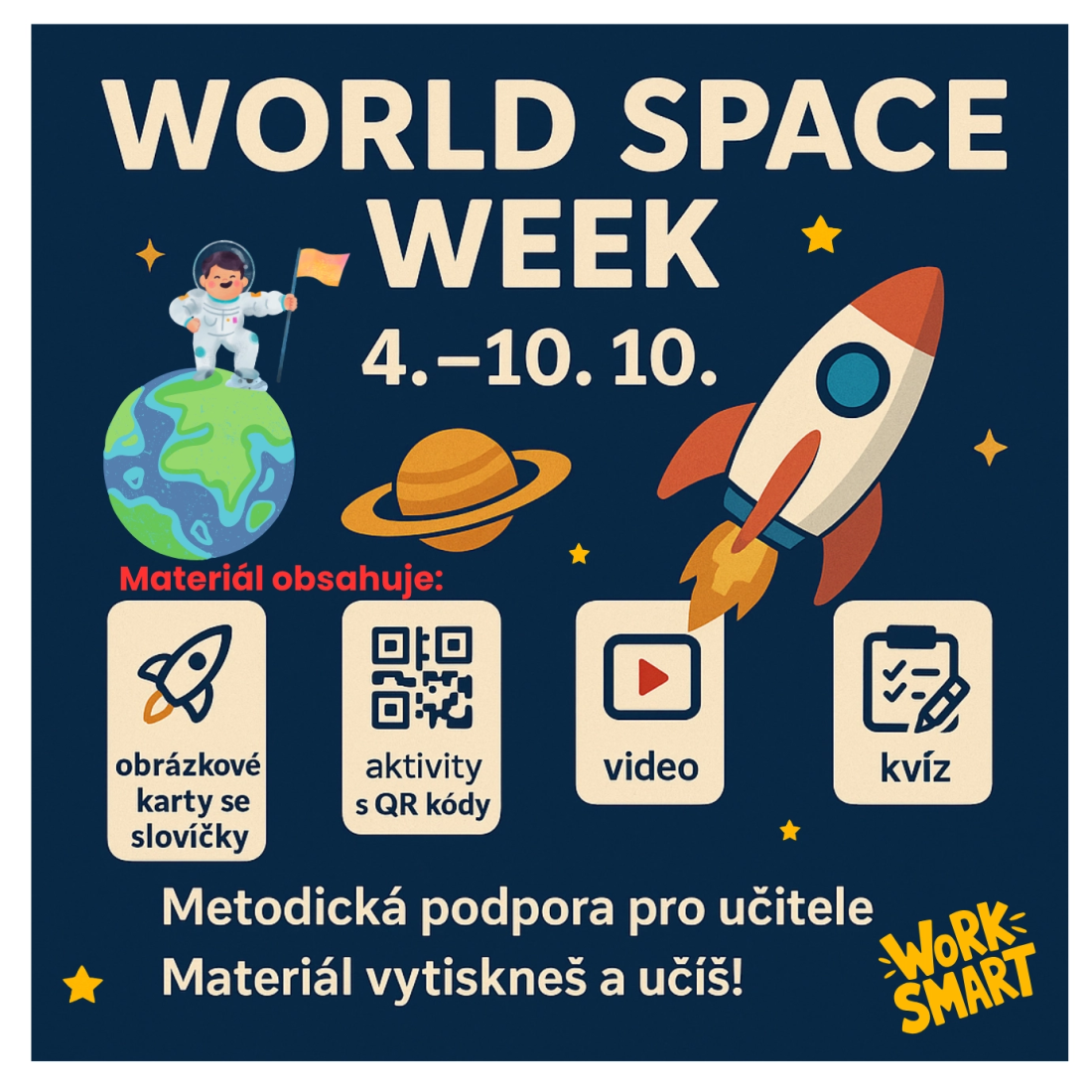 Materiál, který přinese dětem spoustu radosti, nové znalosti a chuť objevovat vesmír nejen v učebnici, ale i kolem sebe. Podporujete tím nejen výuku angličtiny, ale i osvětu o vesmíru a vědě, která má za cíl inspirovat novou generaci objevitelů! Propojení angličtiny s přírodovědou/prvoukou. Mnoho využití - projektový den/týden/doplněk celoroční vesmírné hry nebo jen jako oživení výuky angličtiny.