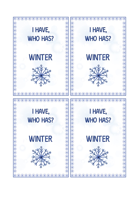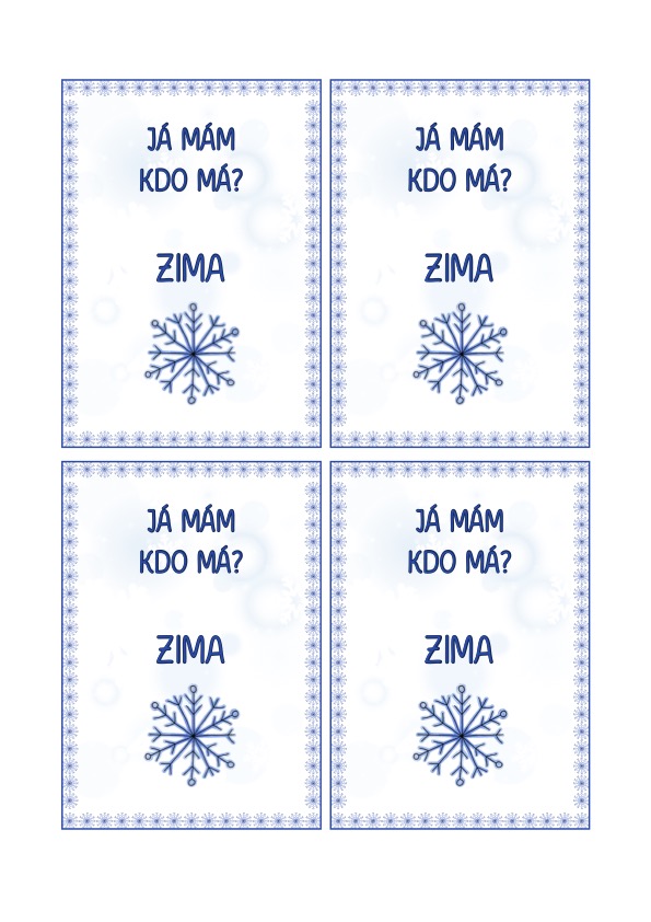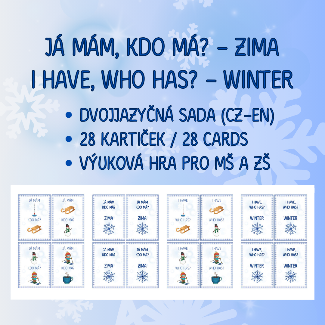 Výuková hra „Já mám, kdo má?“ na téma Zima. Obsahuje 28 kartiček v české i anglické verzi. Vhodná do MŠ, ŠD a 1. stupně ZŠ. Děti rozšiřují slovní zásobu, učí se naslouchat a reagovat na spolužáky, trénují spolupráci a komunikaci.