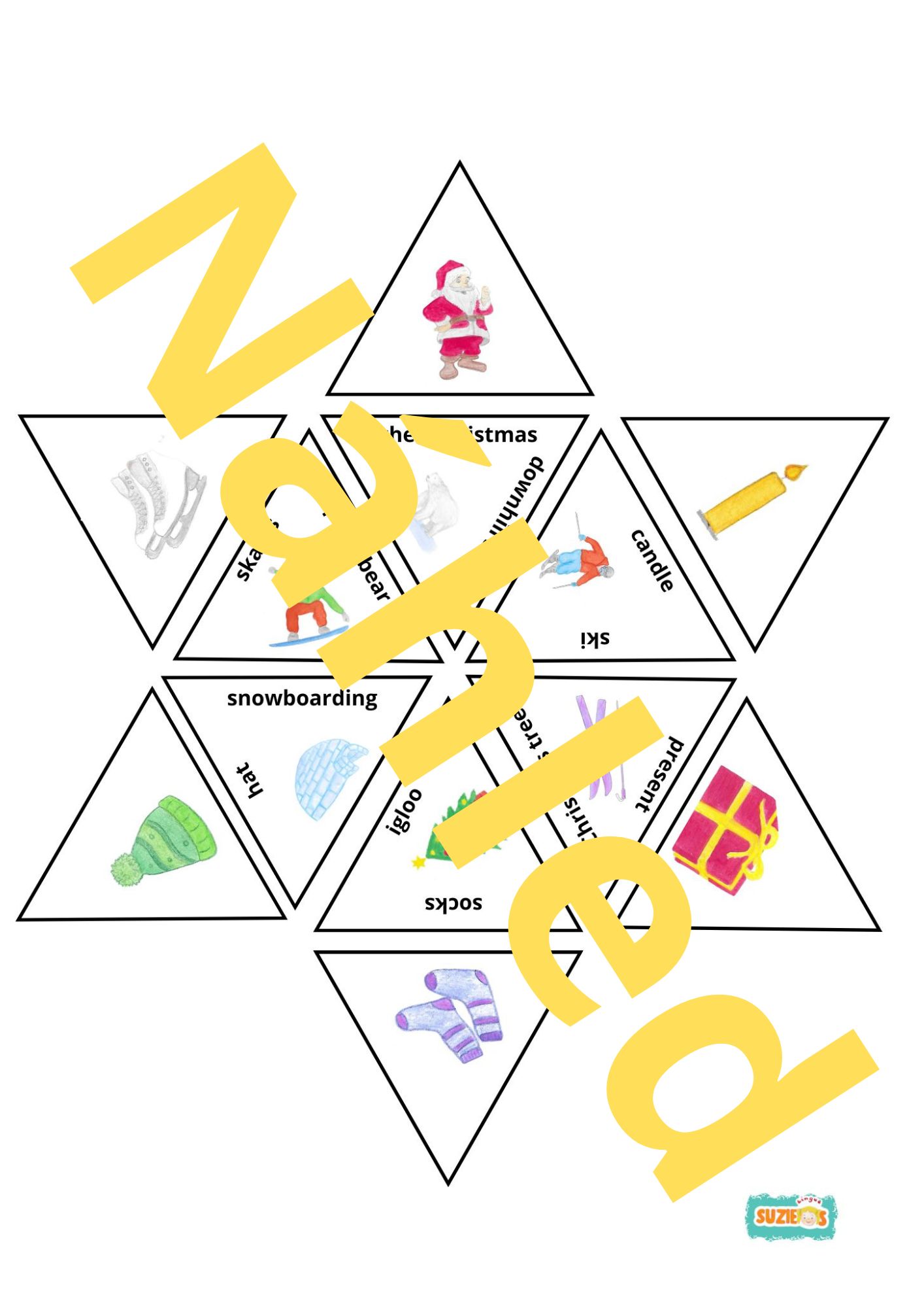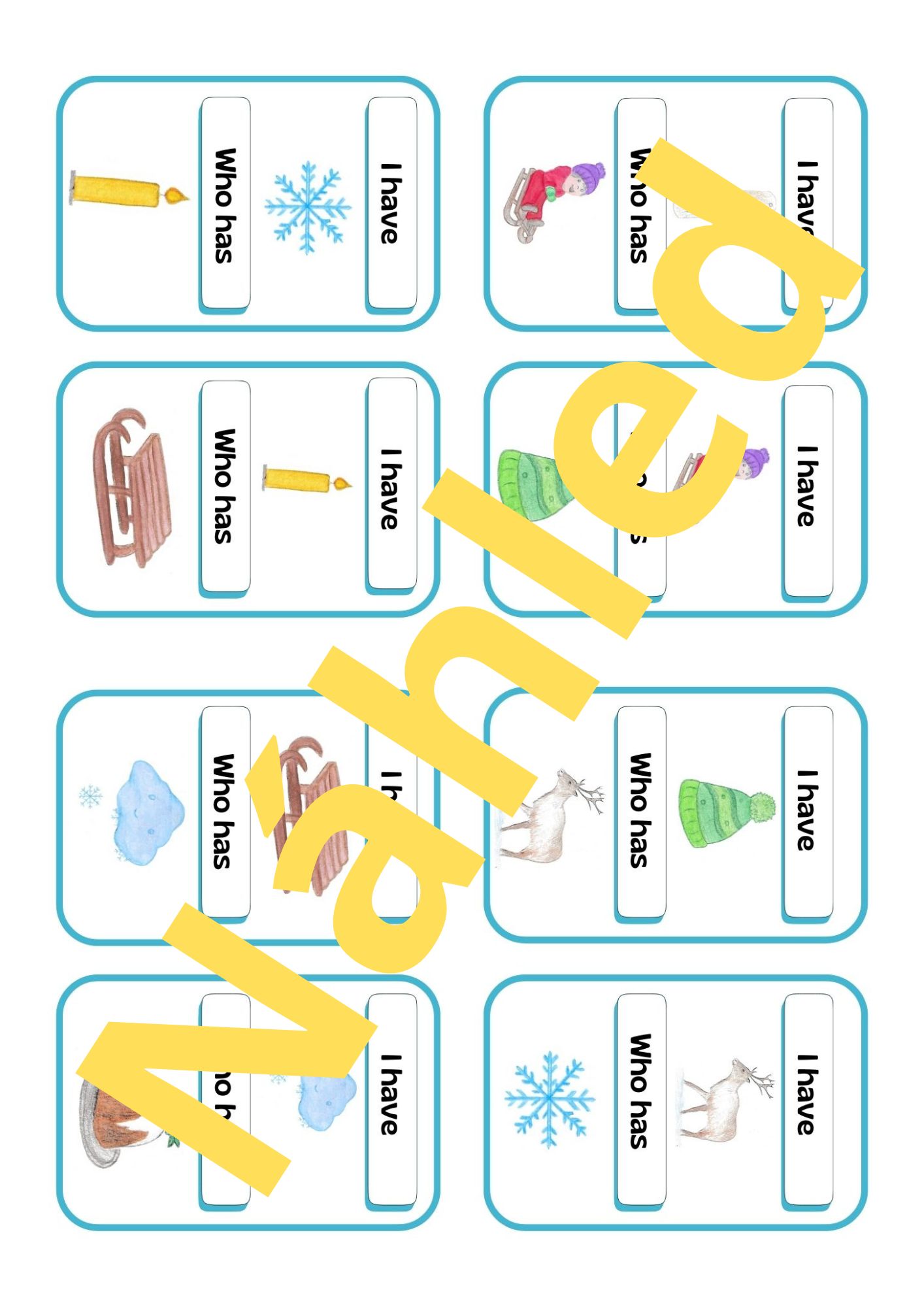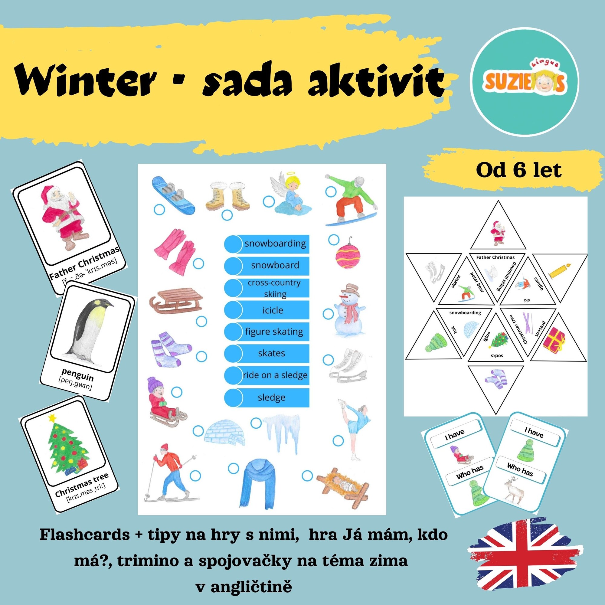 Materiál na téma zima v angličtině obsahuje 40 flashcards s výslovností, aktivity k flashcards, hru Já mám, kdo má?, 4 trimina, 5 spojovaček, obrázkový slovníček s výslovností a manuál.