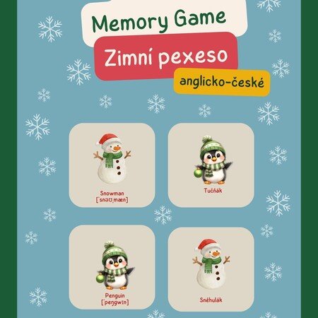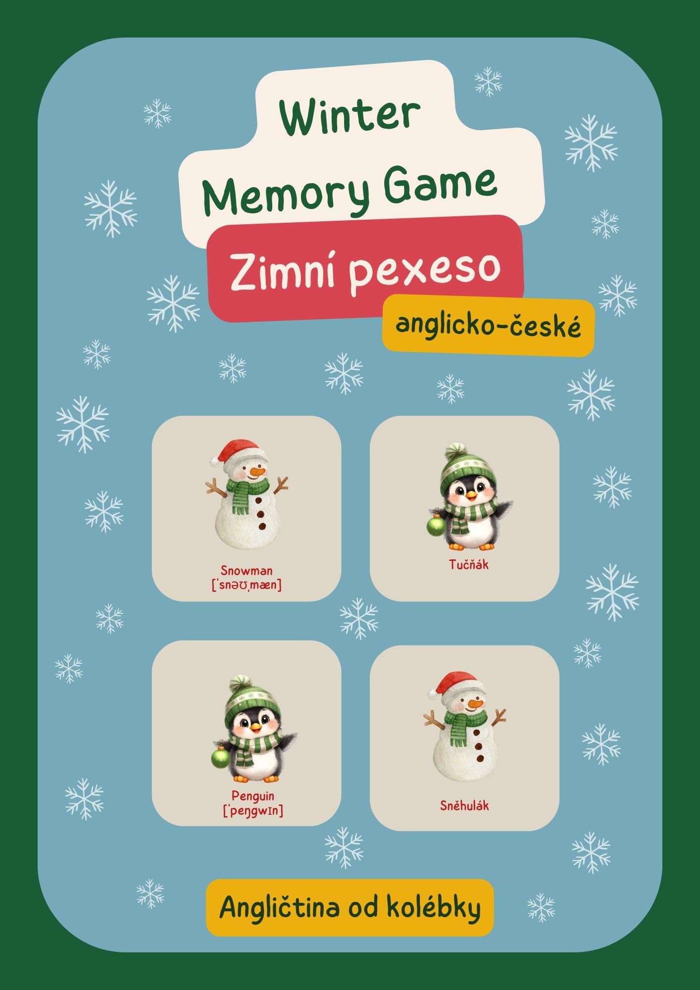 Zimní pexeso obsahuje 18 kartiček se zimními slovíčky, český překlad i výslovnost, takže ho zvládne každý (pra)rodič.