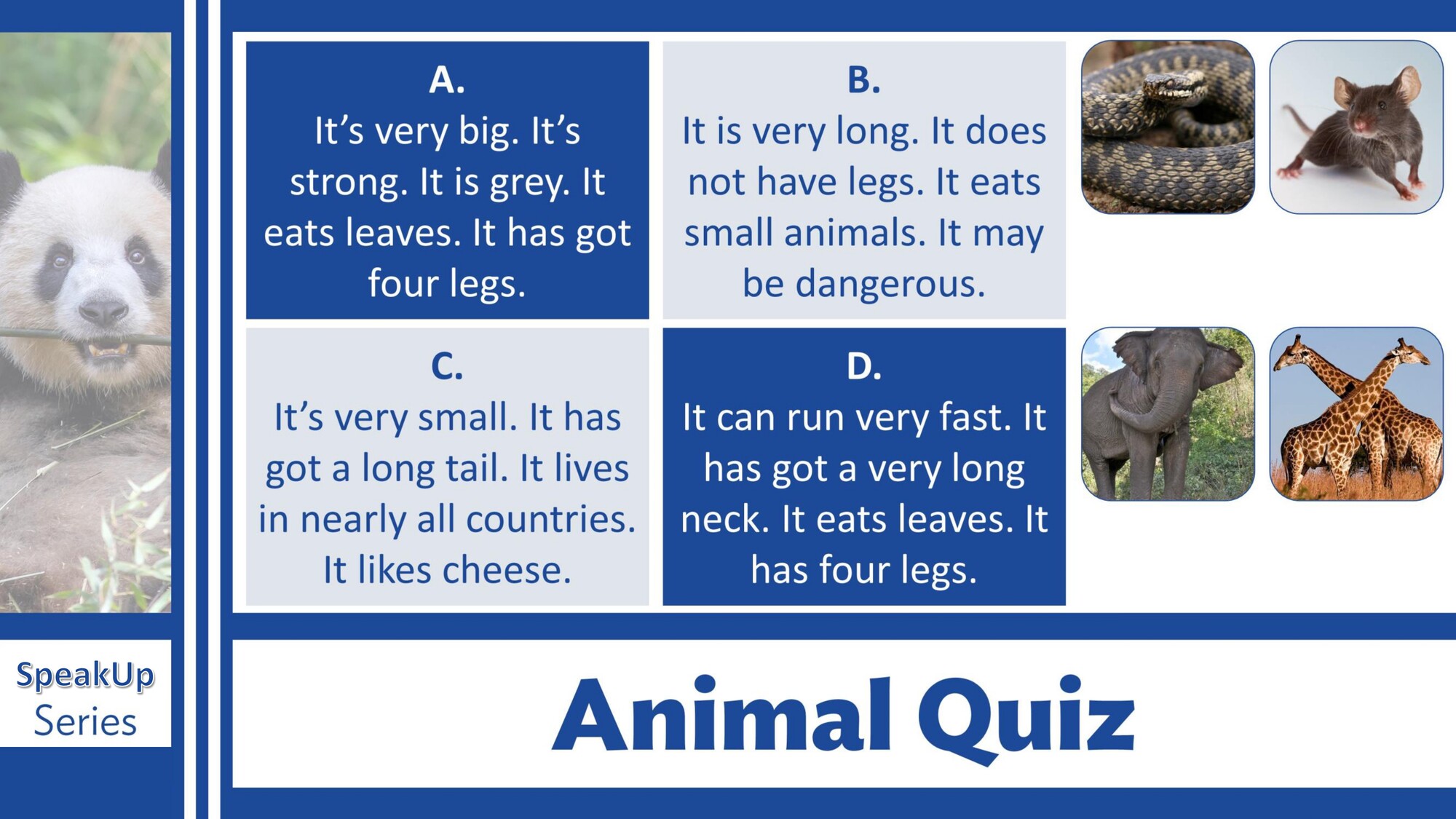 - Animal quiz – popisy zvířat formou hádanek (čtení + porozumění)