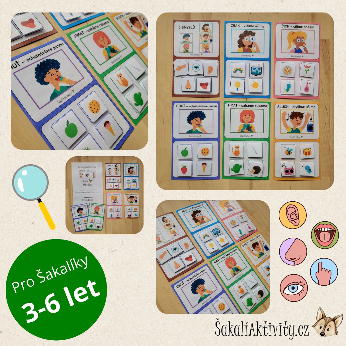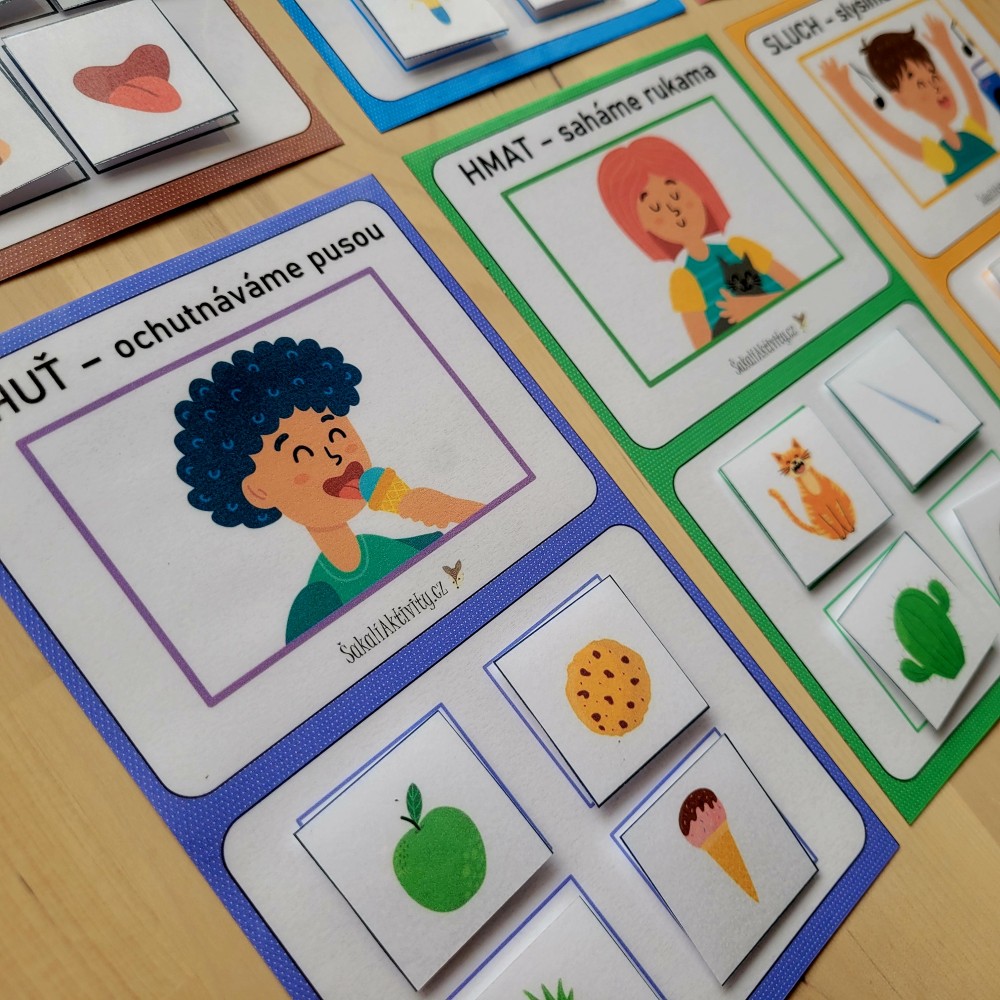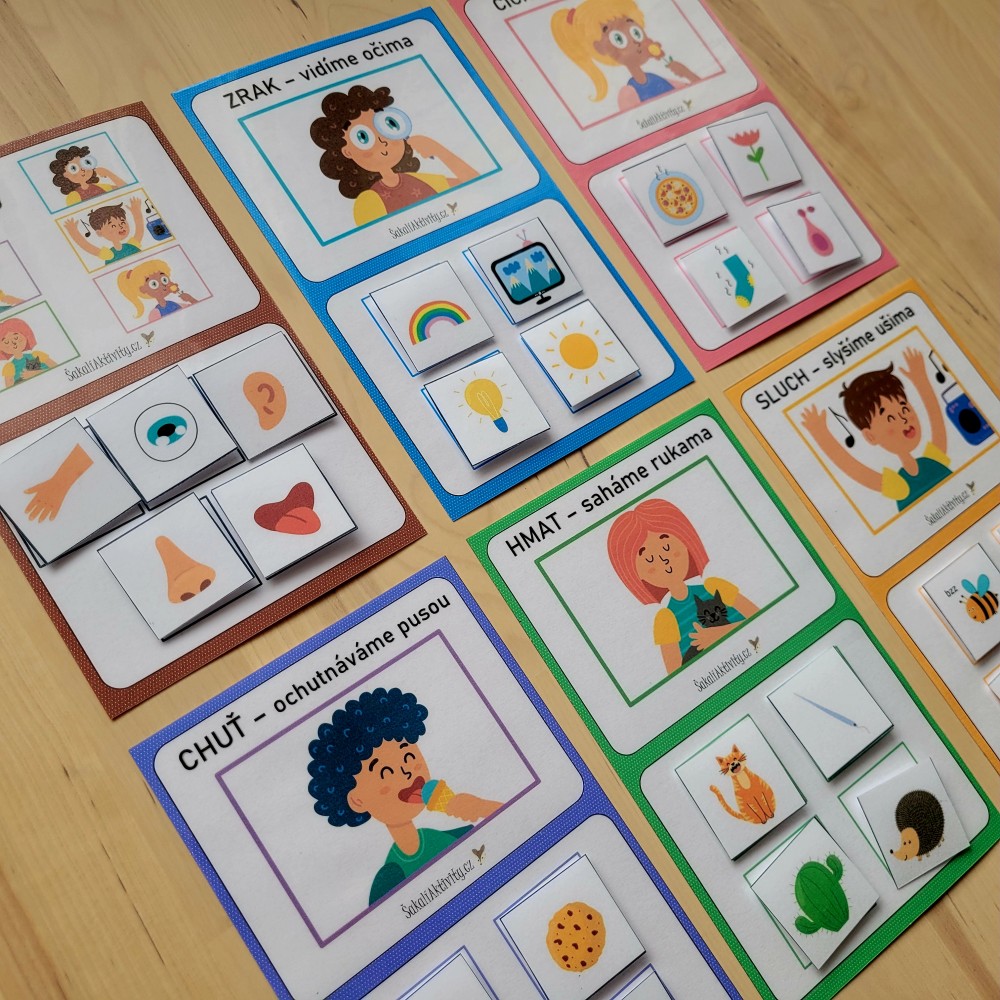 Sada obsahuje 6 předlohových karek k doplnění a sadu 25 obrázků s předměty. Dítě předměty třídí podle předlohových karet podle toho jakým smyslem je vnímá - čich, zrak, chuť, hmat, sluch. Poslední karta je určena na umístění všech pěti smyslových orgánů.