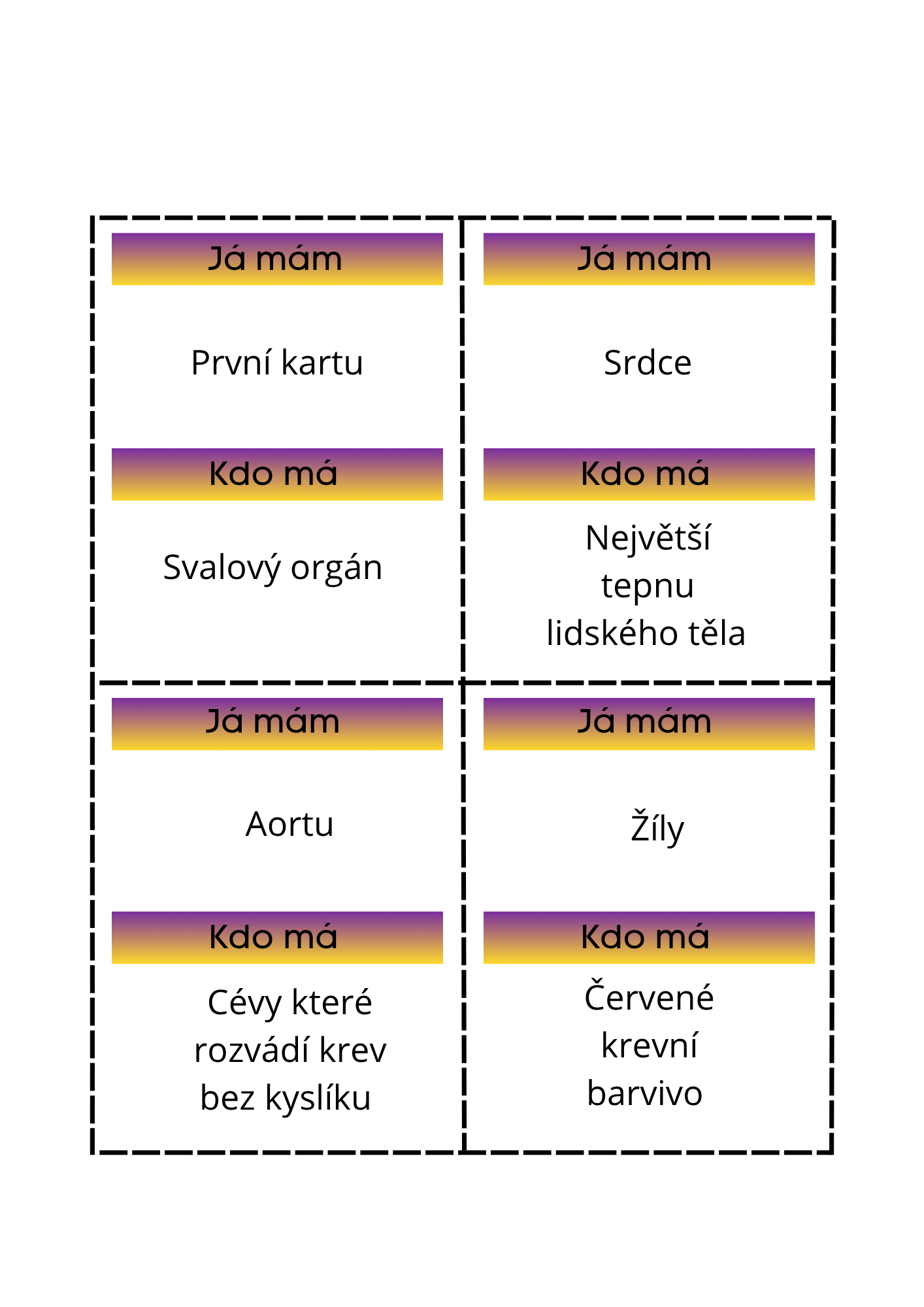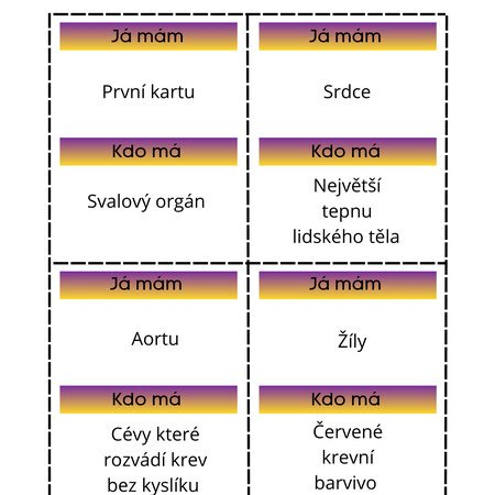 Kartičky pro žáky- Já mám, kdo má. Vhodné na opakování cévní soustavy.