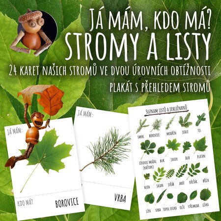 - Dvě sady po 24 kartách – jednodušší verzi s názvy stromů u fotografií a složitější verzi, kde děti poznávají stromy samostatně jen podle obrázku.