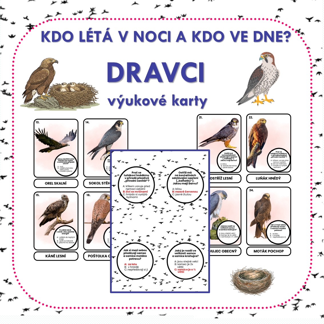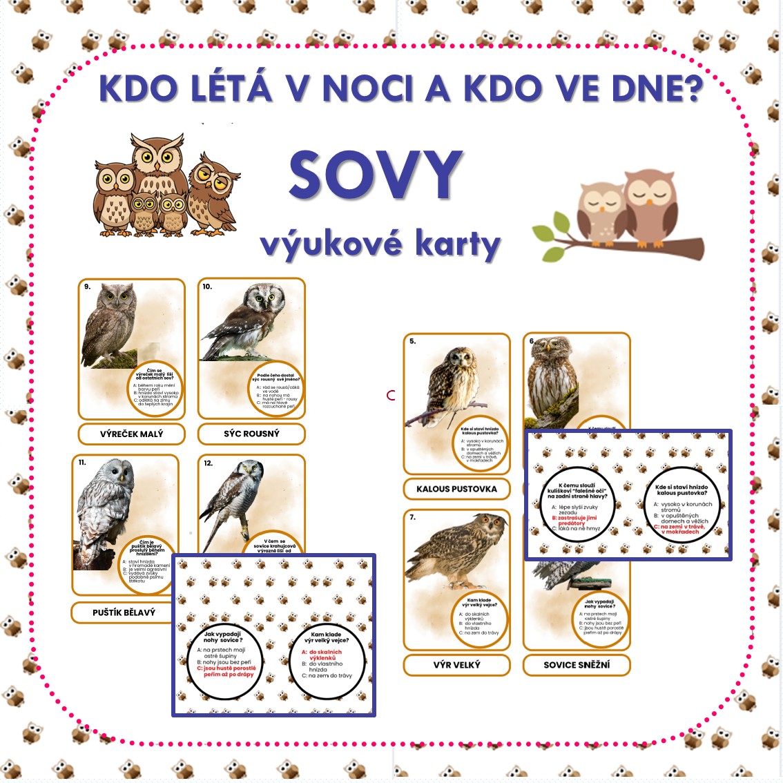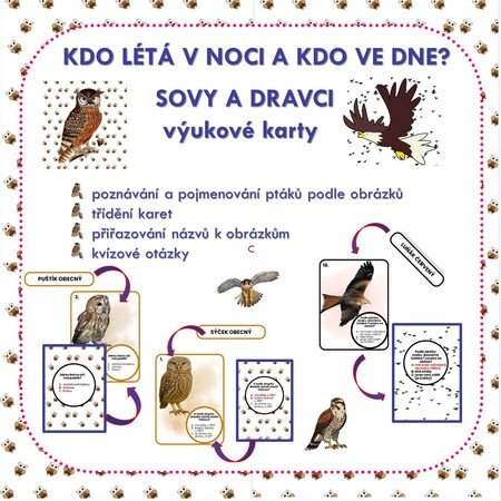ü 6 oboustranných karet s obrázky sov a dravců, zvlášť je uveden jejich název