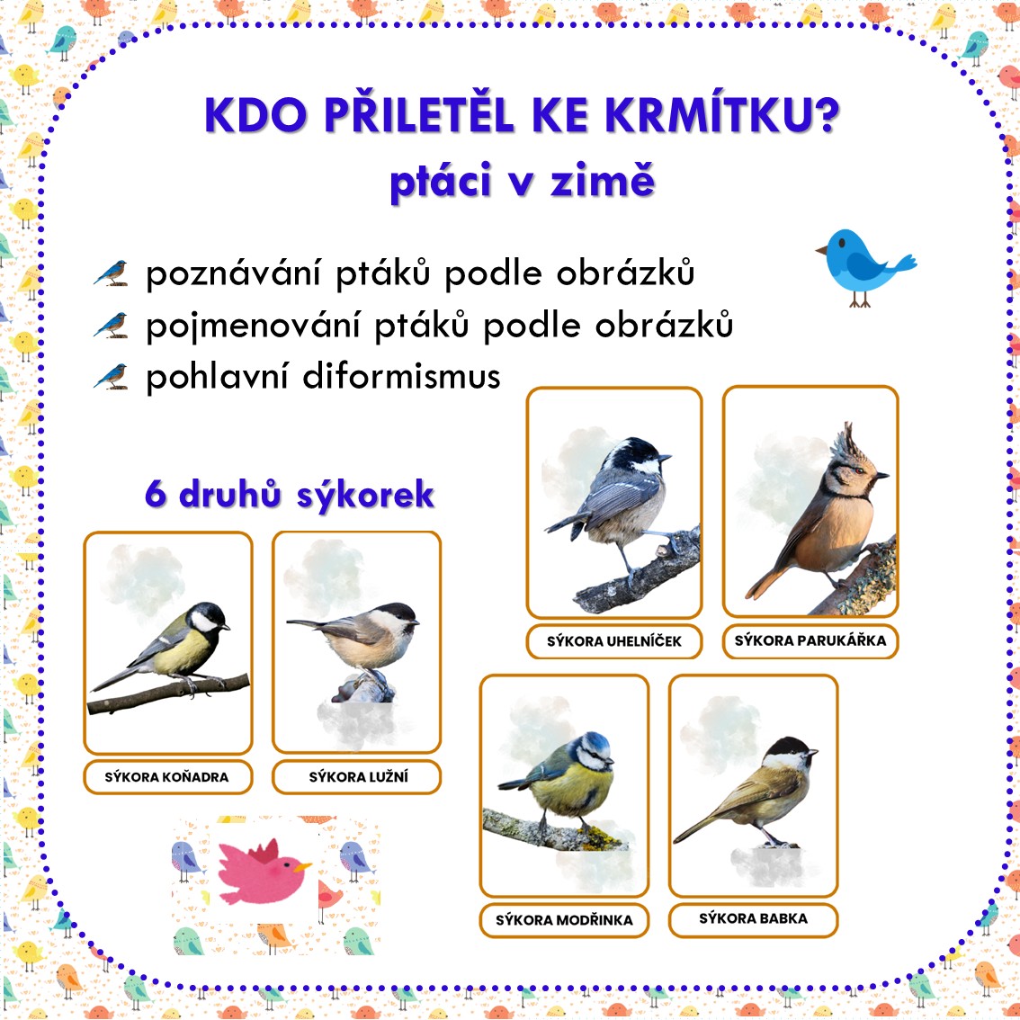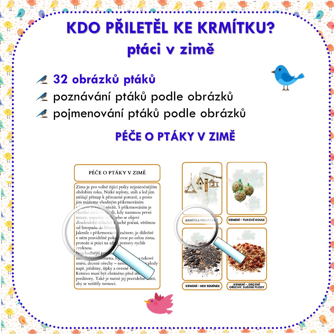Materiál je zaměřen na poznávání nejčastějších druhů ptáků, kteří v zimním období přilétají ke krmítkům v České republice. Prostřednictvím názorných obrázků se žáci seznamují s jednotlivými druhy ptáků, jejich vzhledem, u některých mohou pozorovat rozdíly mezi samcem a samicí (pohlavní dimorfismus), získají informace o základních zásadách péče o ptáky v zimě. Materiál podporuje rozvoj pozorovacích schopností, třídění informací, práci s obrazovým materiálem a vztah k přírodě.