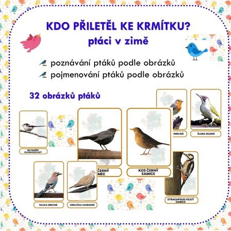 · Poznávání a pojmenování ptáků podle obrázků: názvy ptáků nejsou uvedeny přímo na obrázkové kartě, což umožňuje aktivní práci