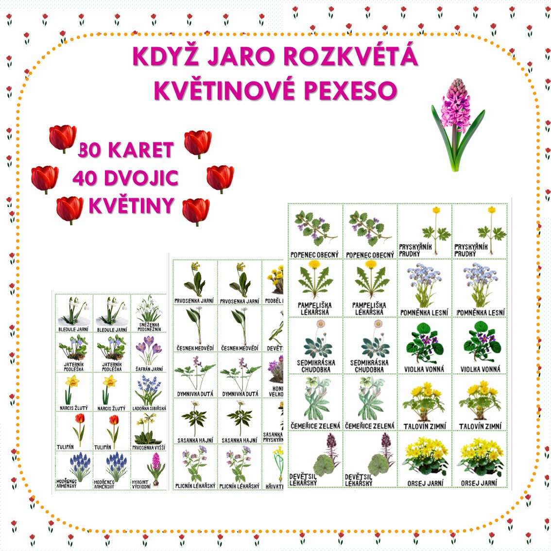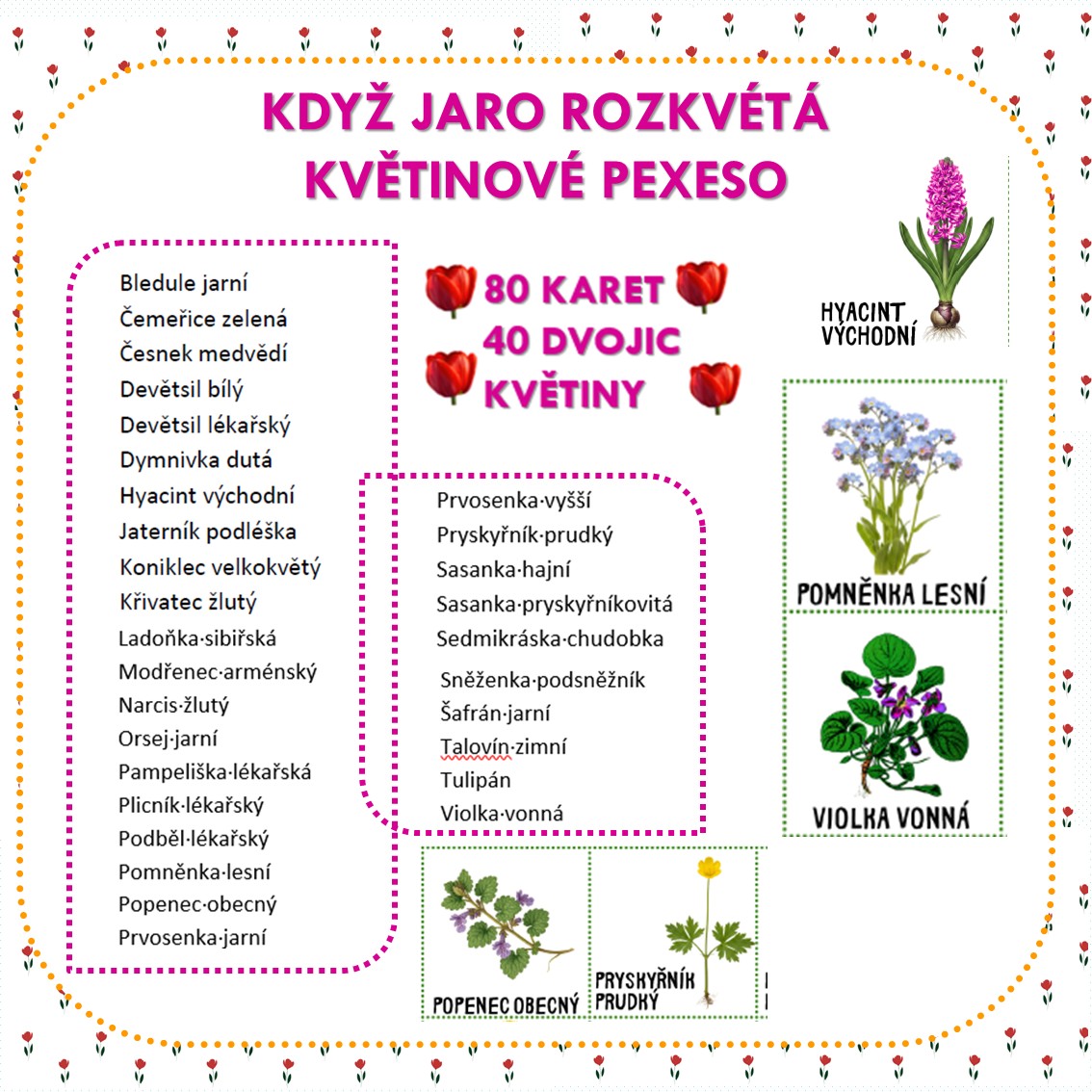 Pexeso obsahuje 40 dvojic kartiček (celkem 80 obrázků) s ilustracemi květin a jejich názvy.