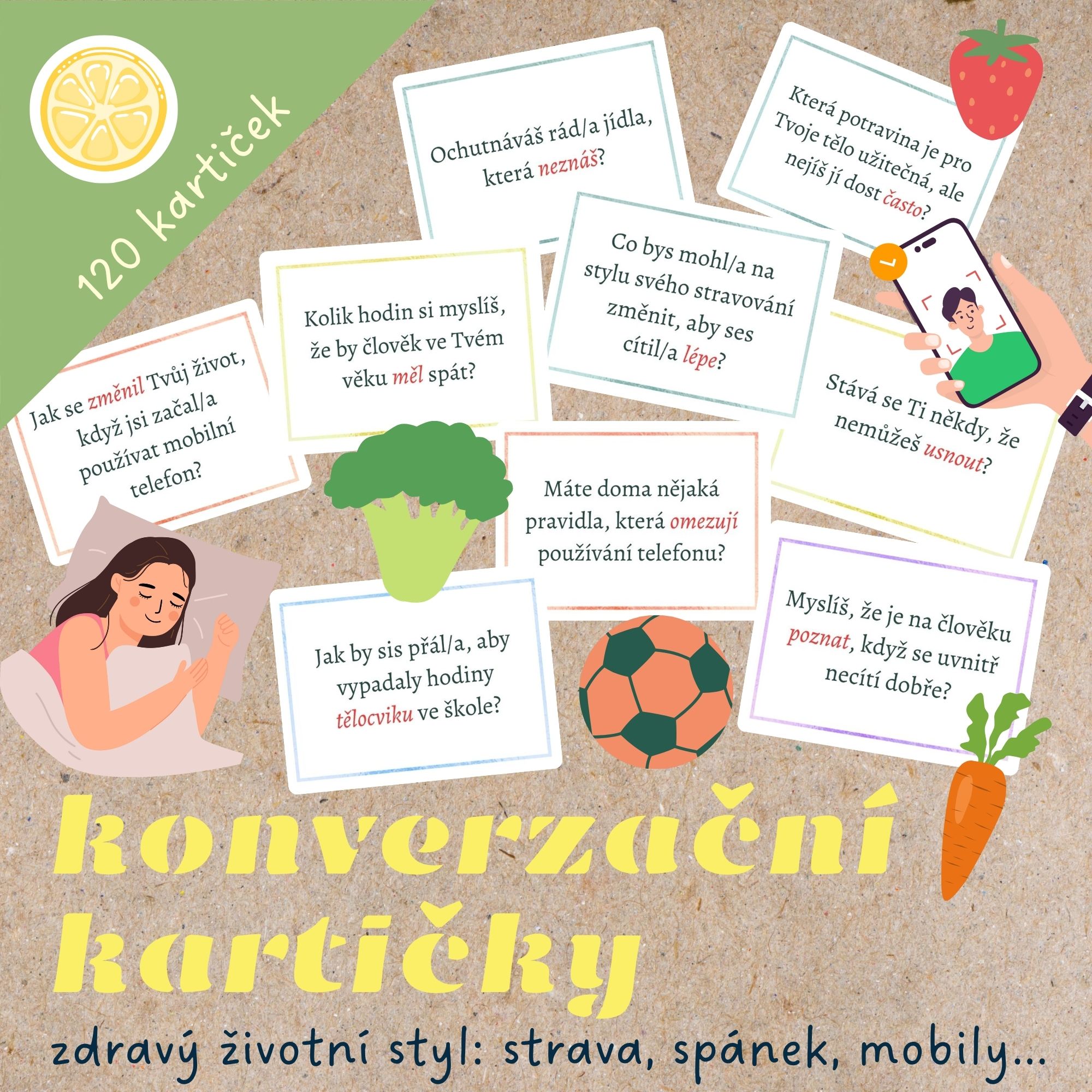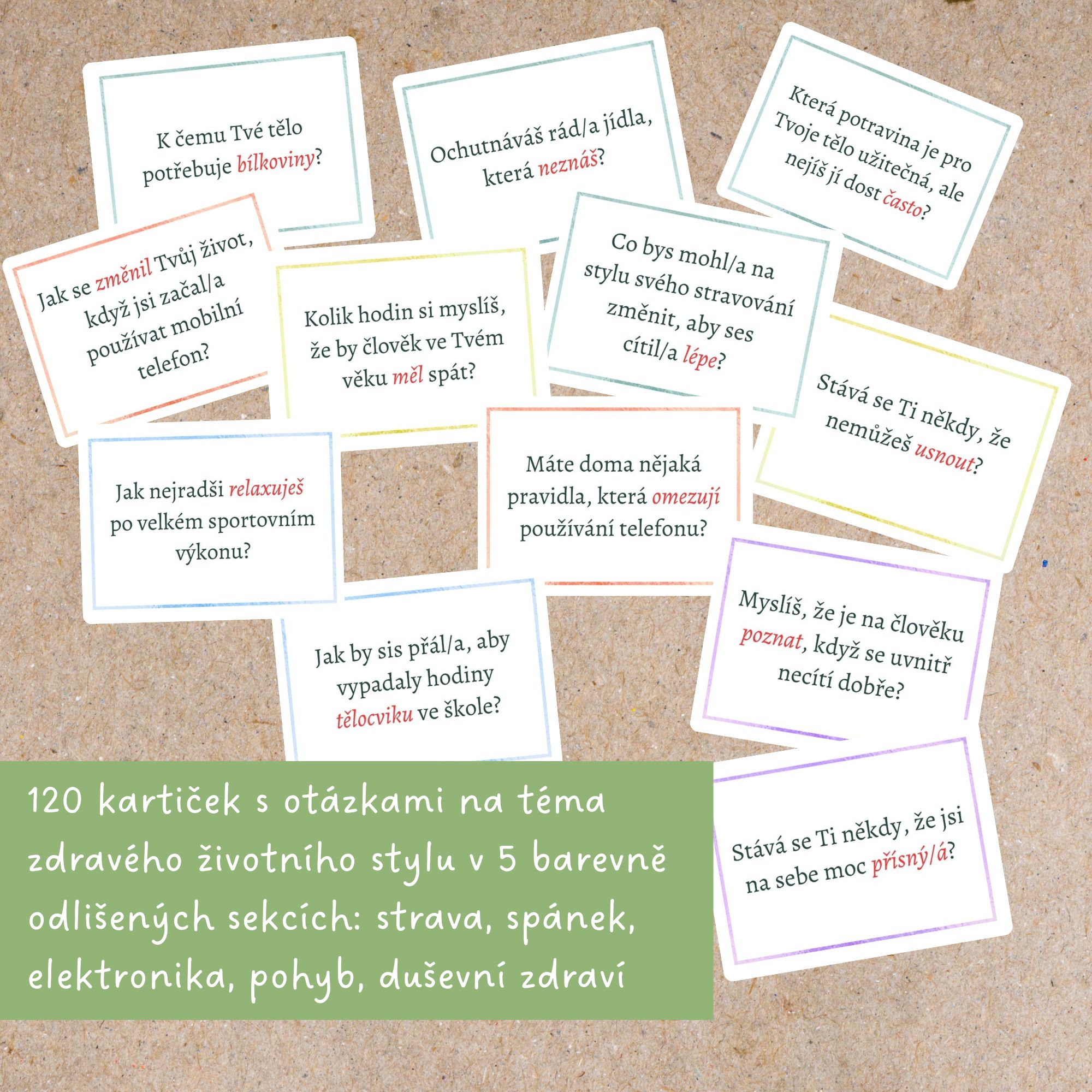 🥦Kartičky jsou rozdělené do pěti sekcí: strava, spánek, elektronika, sport a duševní zdraví. Každá sekce je barevně odlišená a obsahuje sérii otevřených otázek, které zkoumají postoje dětí bez toho, aby je tlačily do některé z odpovědí. „Správné” odpovědi by měly samy vykrystalizovat během společné debaty ve třídě.