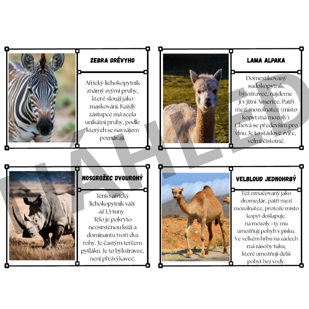 Kopytníci - 22 zástupců (trojkarty - jméno, obrázek, informace)