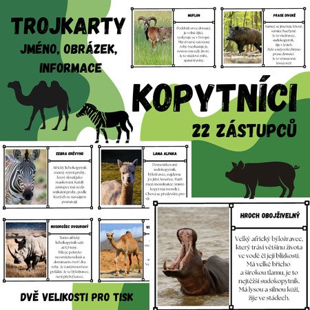 Kopytníci - trojkarty22 zástupců lichokopytníků a sudokopytníkůkarty jsou rozděleny na tři části (jméno, obrázek, informace)PDF formát, dvě velikosti pro tisk