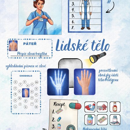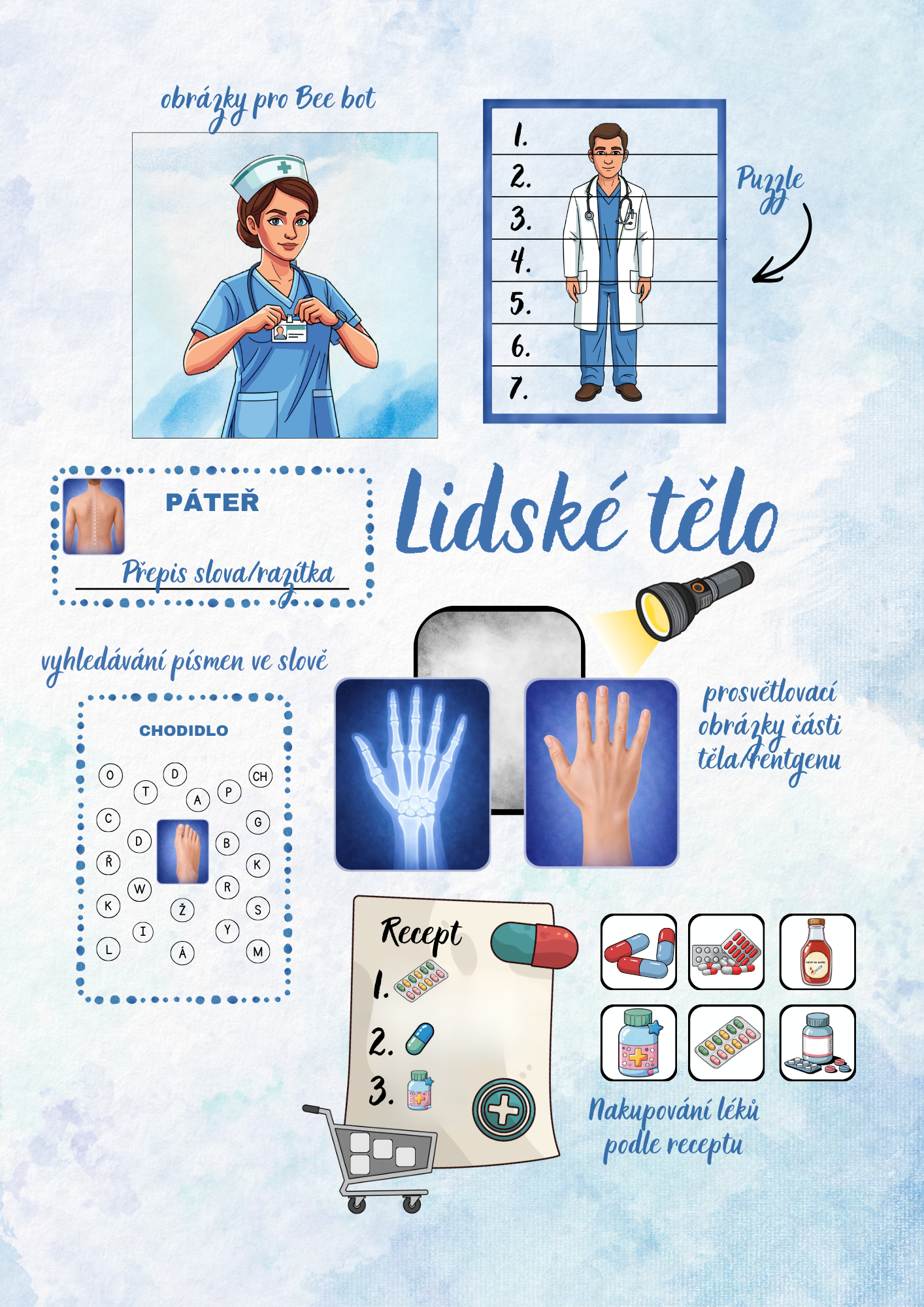 Upevňují názvy částí lidského těla, rozvíjejí předčtenářské dovednosti (analýza slov, vyhledávání písmen), procvičují grafomotoriku a práci se slovy, trénují logické myšlení při nakupování léků podle receptu, rozvíjejí spolupráci při práci s Bee-Botem, procvičují zrakové vnímání a pozornost při skládání puzzle a prosvětlování obrázků