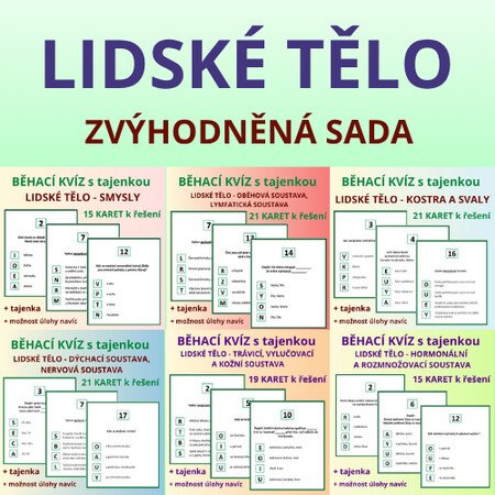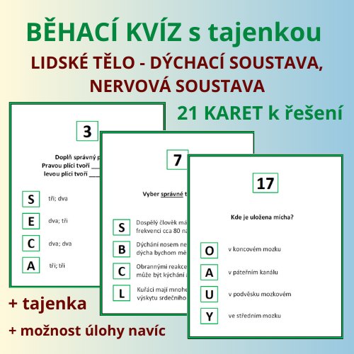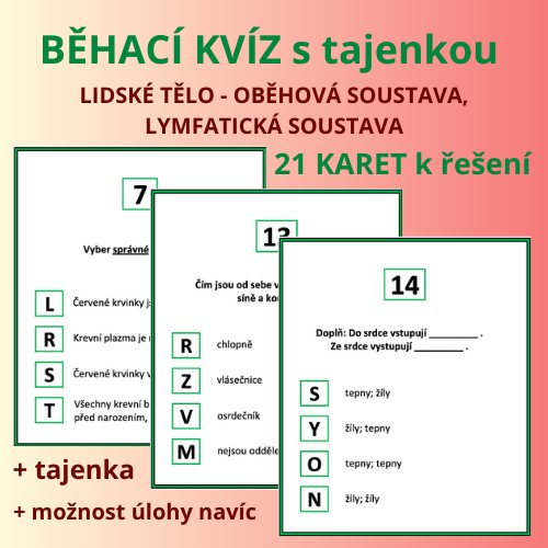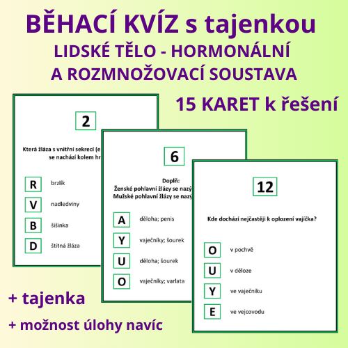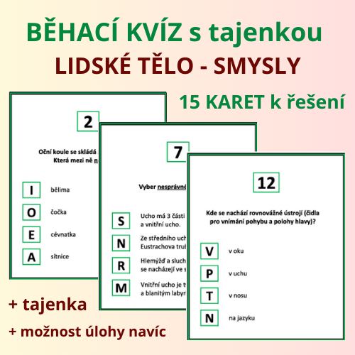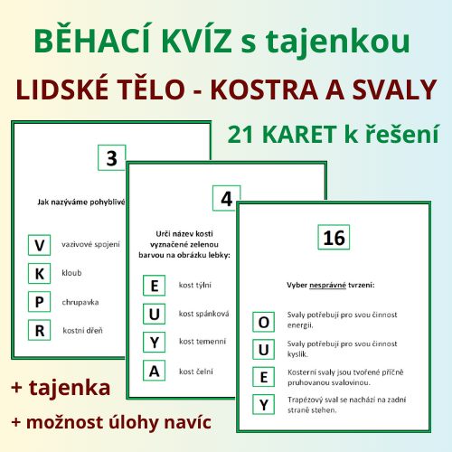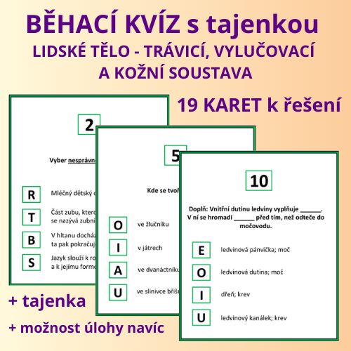 Každý kvíz obsahuje karty + list k napsání tajenky. Každá karta obsahuje zadání úlohy + 4 možnosti. Do tajenky žáci napíšou písmeno, které je uvedeno u správného řešení úlohy.