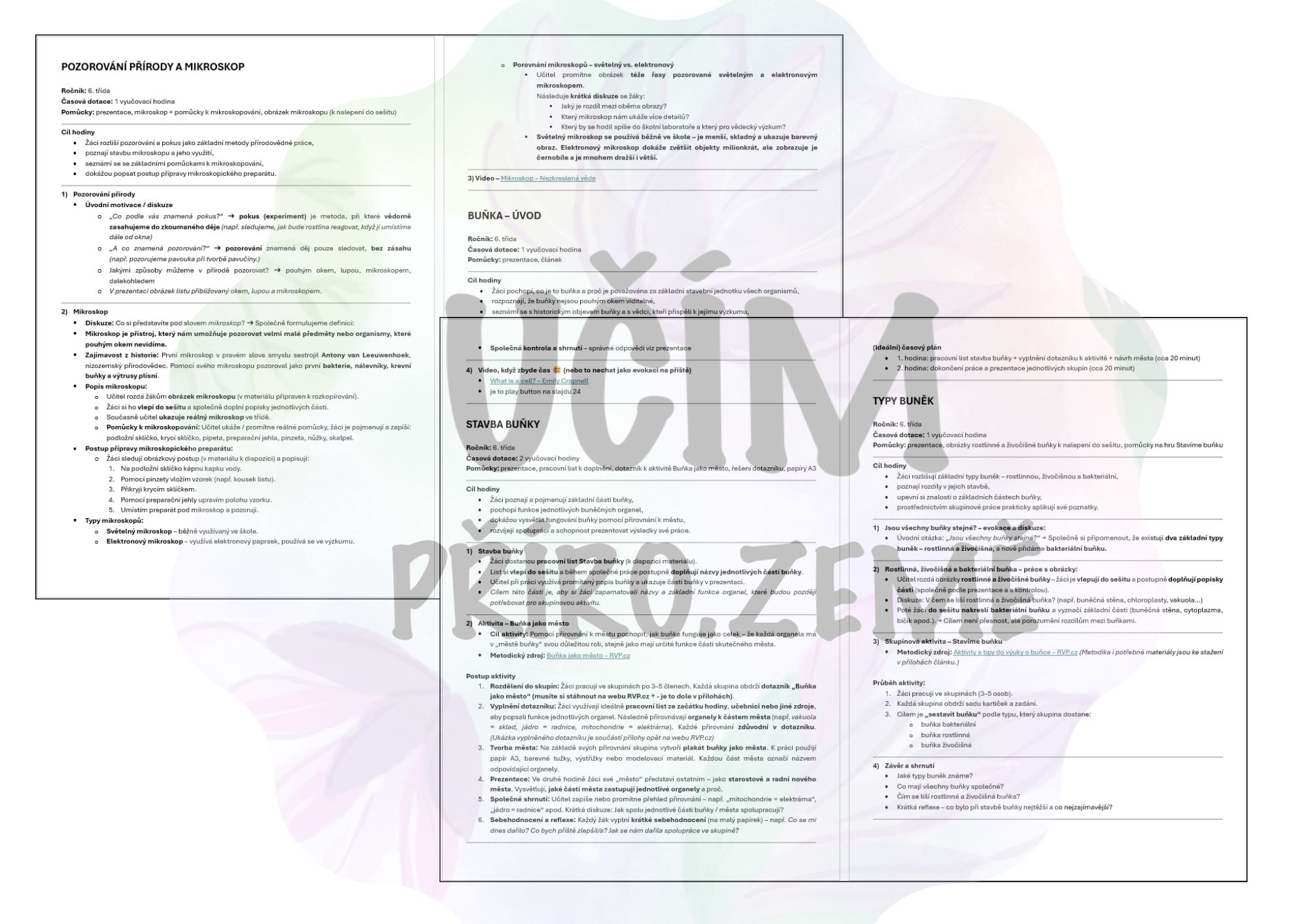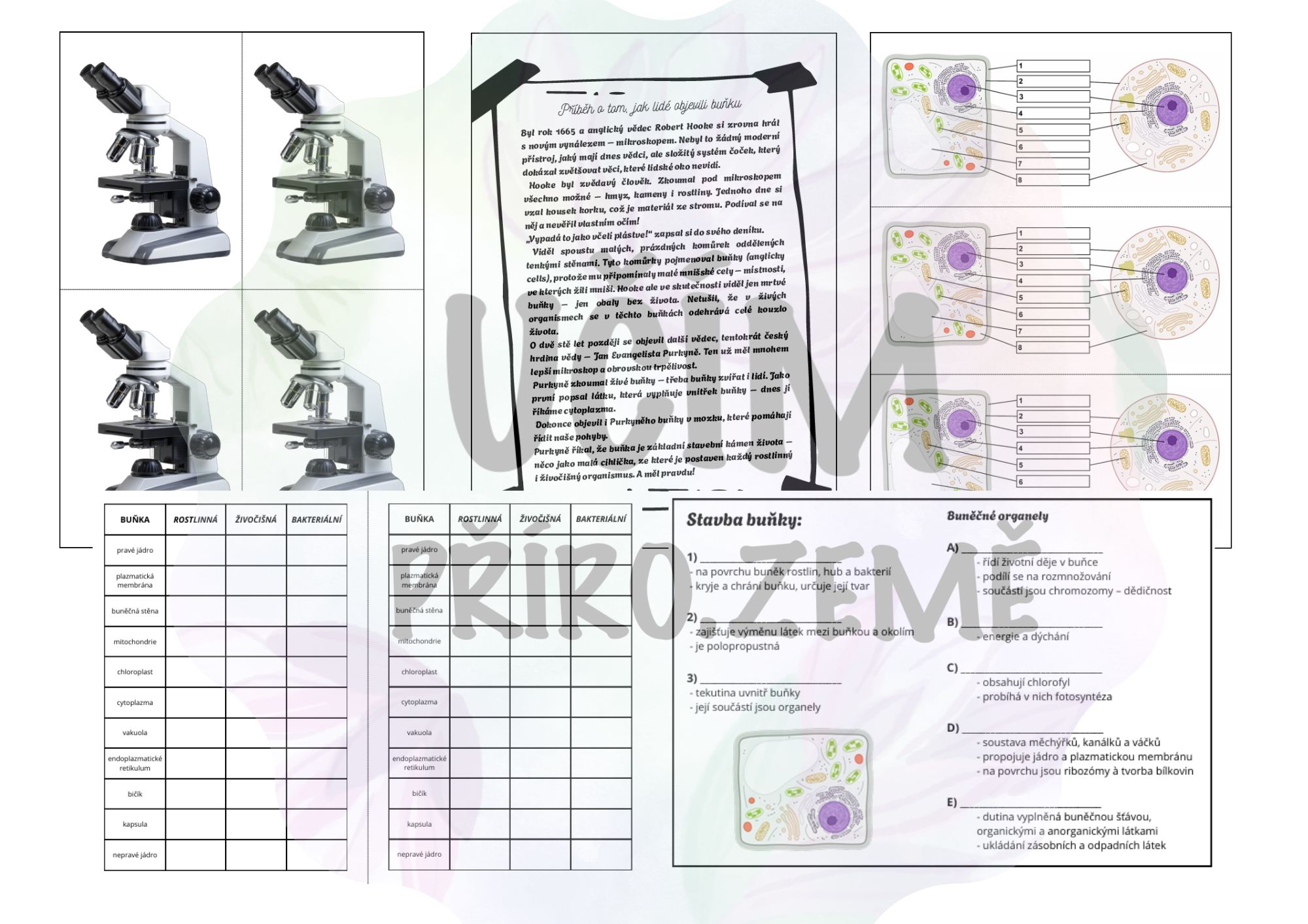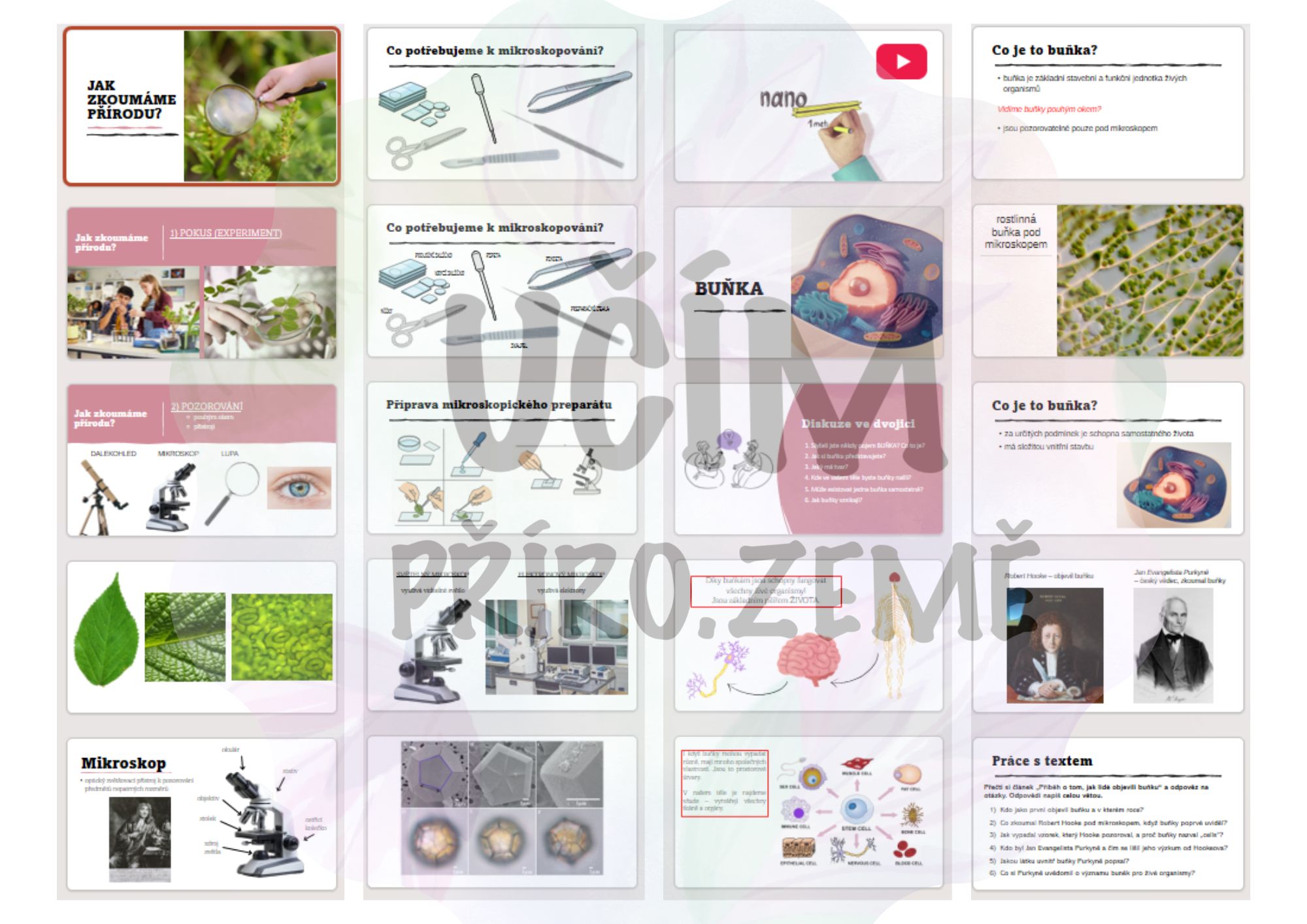 Najdete zde podrobnou čtyřstránkovou přípravu na 4–5 vyučovacích hodin, interaktivní prezentaci s 37 slajdy, pracovní listy k rozkopírování, obrázky buňky i mikroskopu a písemku na závěr.