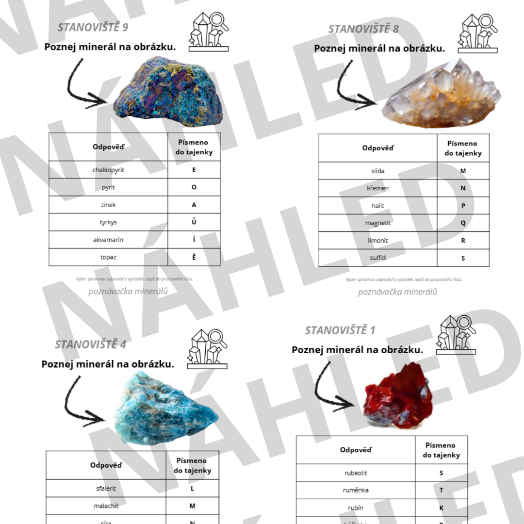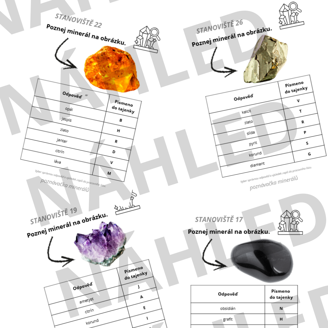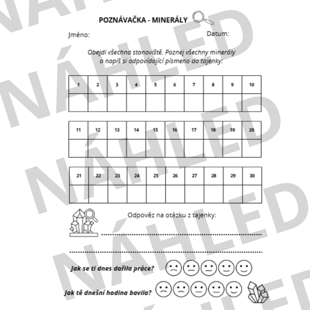 - obsahuje 30 stanovišť (dvě velikosti pro tisk) a pracovní list (dvě velikosti pro tisk) a výsledky pro snadnou kontrolu