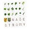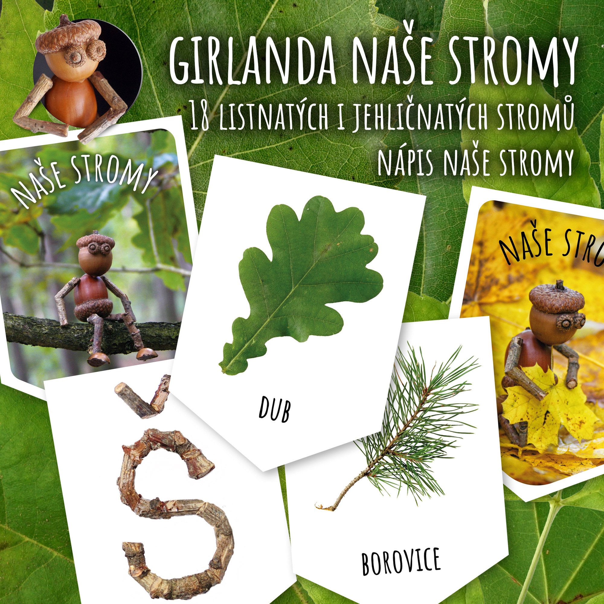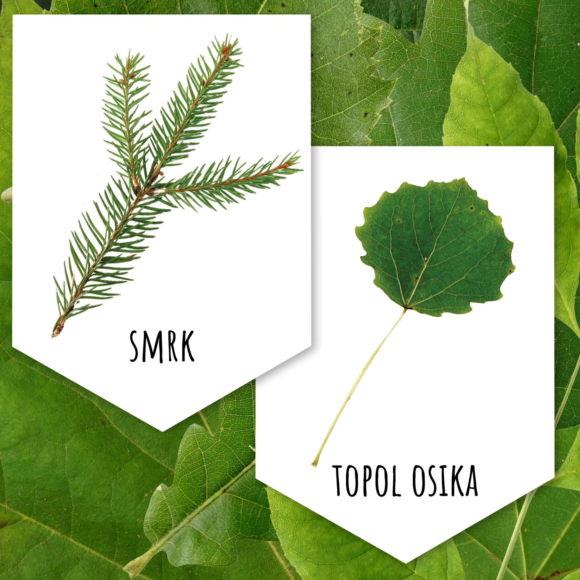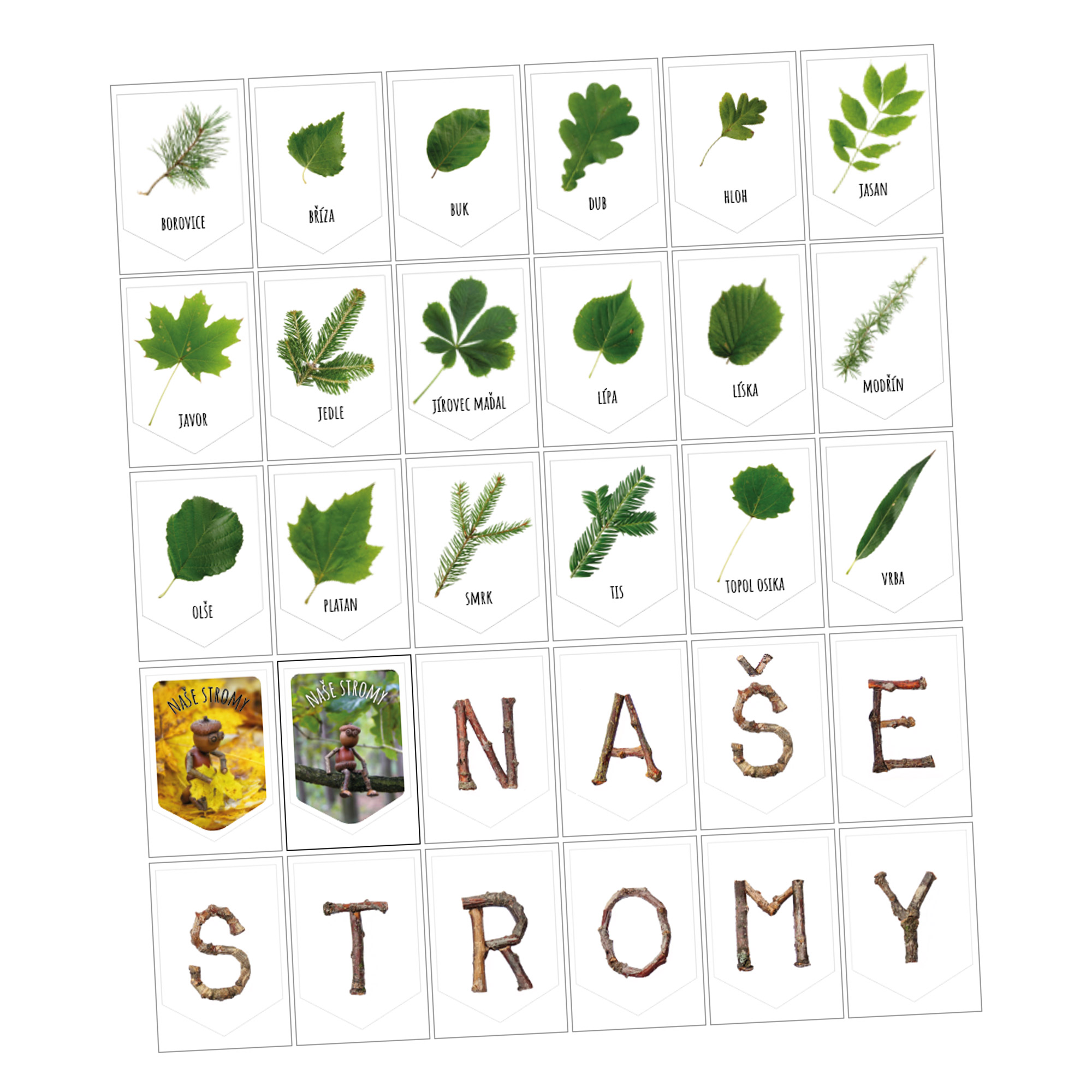 - 18 vlaječek s realistickými fotografiemi listů a větviček různých stromů doplněnými názvy stromů.