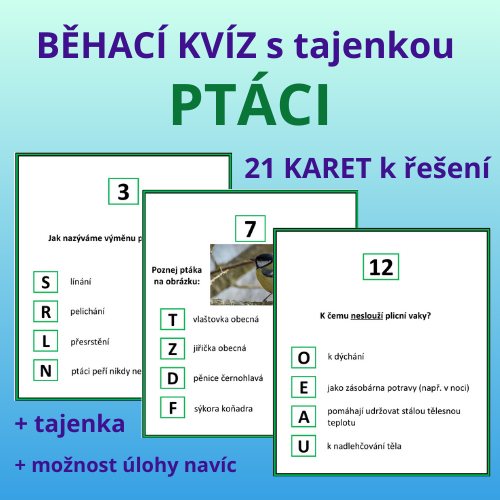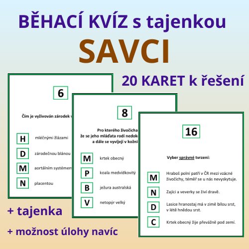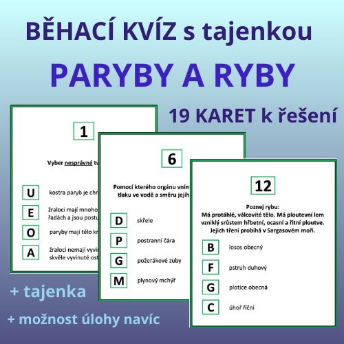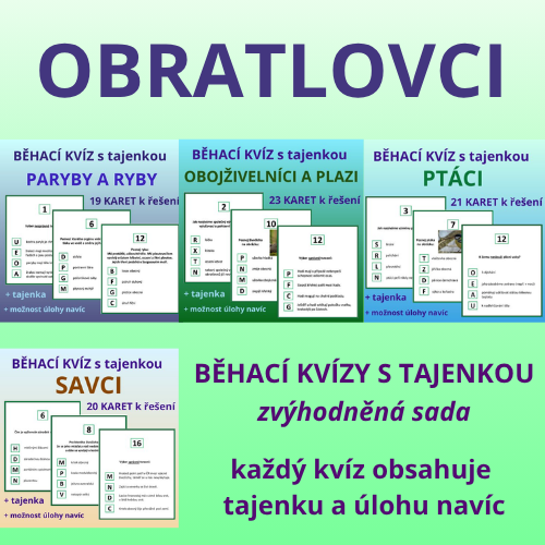 Každý kvíz obsahuje karty + list k napsání tajenky. Každá karta obsahuje zadání úlohy + 4 možnosti. Do tajenky žáci napíšou písmeno, které je uvedeno u správného řešení úlohy.