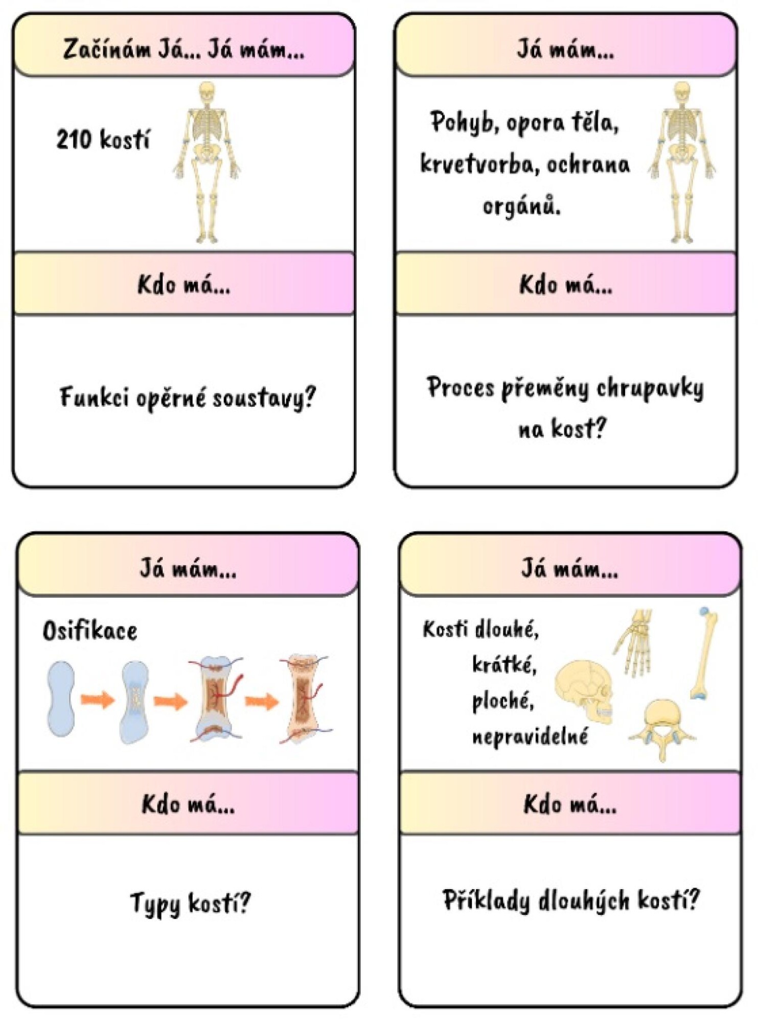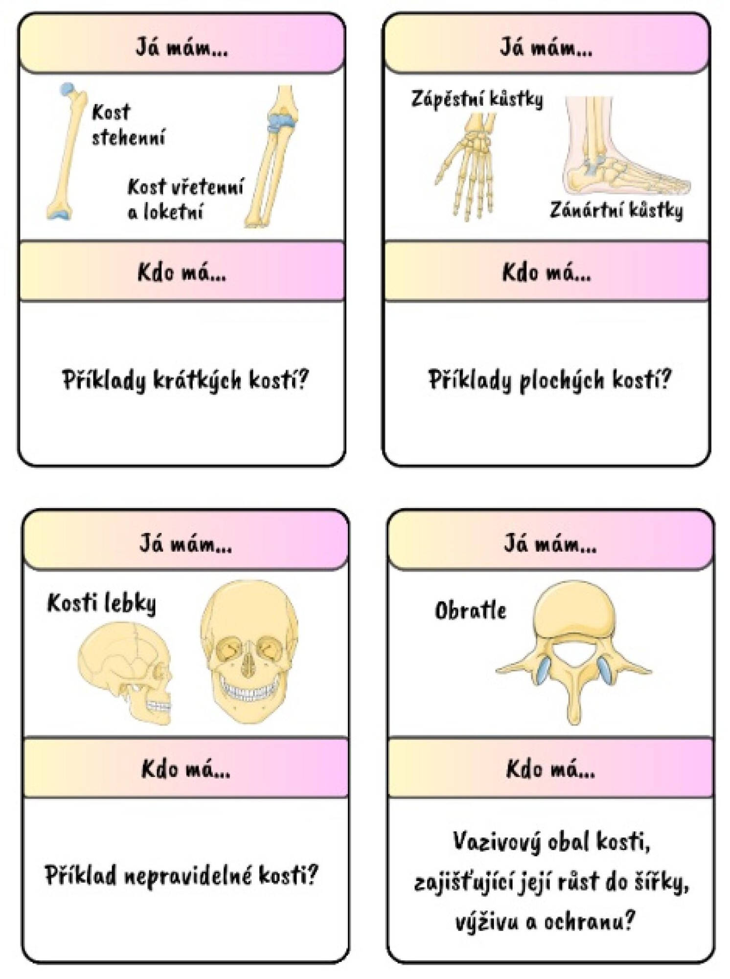 Žáci si hravou formou zopakují problematiku opěrní soustavy, osifikace kostí, typů kostí, stavbu dlouhé kosti, onemocnění opěrné soustavy.