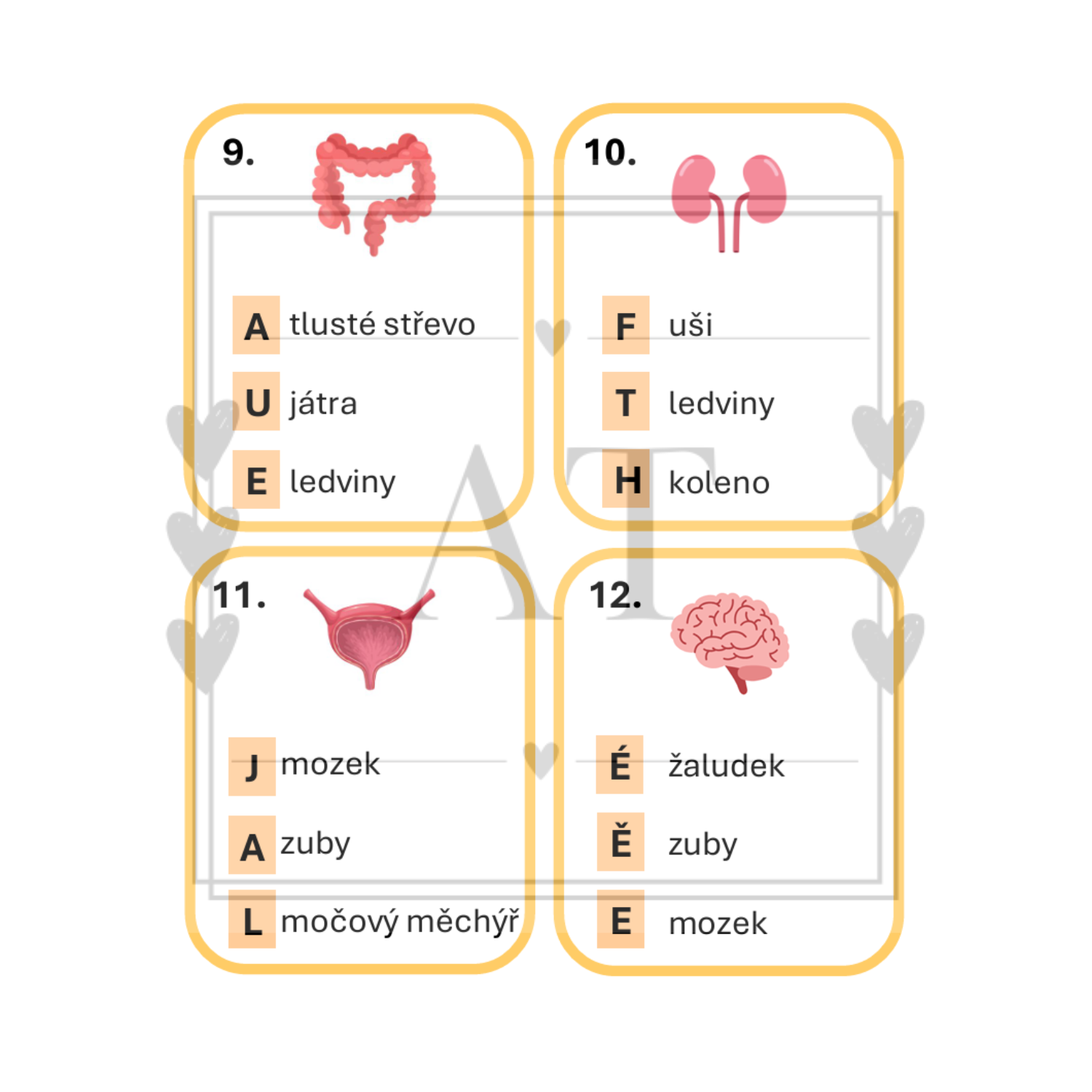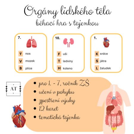 Běhací hra pro žáky 1. - 7. ročníku ZŠ. Soubor obsahuje celkem 12 karet s obrázky orgánů lidského těla. Žáci mají za úkol poznat orgán na obrázku, vybrat jeden název z nabízených možností a zapsat si do tajenky písmeno, které je uvedeno vedle své odpovědi. Stejným způsobem se postupuje u všech dvanácti karet. Po vyluštění žákům vyjde tematicky zaměřená tajenka. Součástí je i kontrolka k pracovnímu listu.