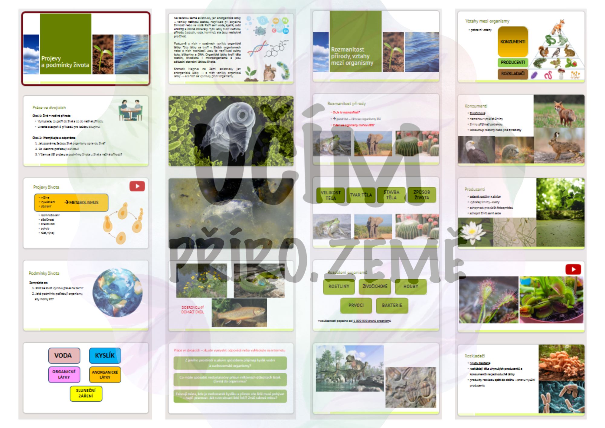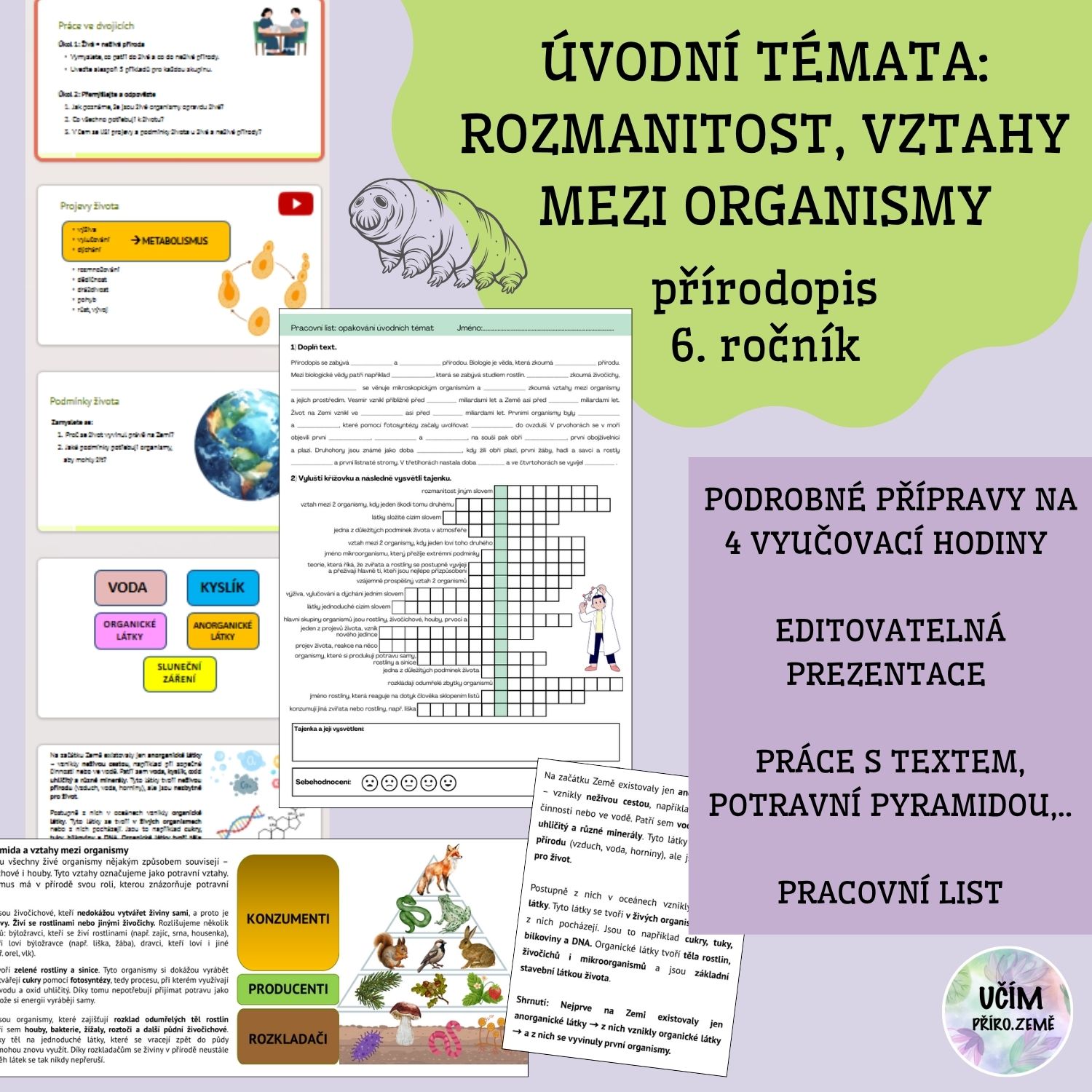 Kompletní výukový balíček pro žáky 6. ročníku k tématům: Projevy a podmínky života, rozmanitost přírody, rozdělení organismů a vztahy mezi organismy.