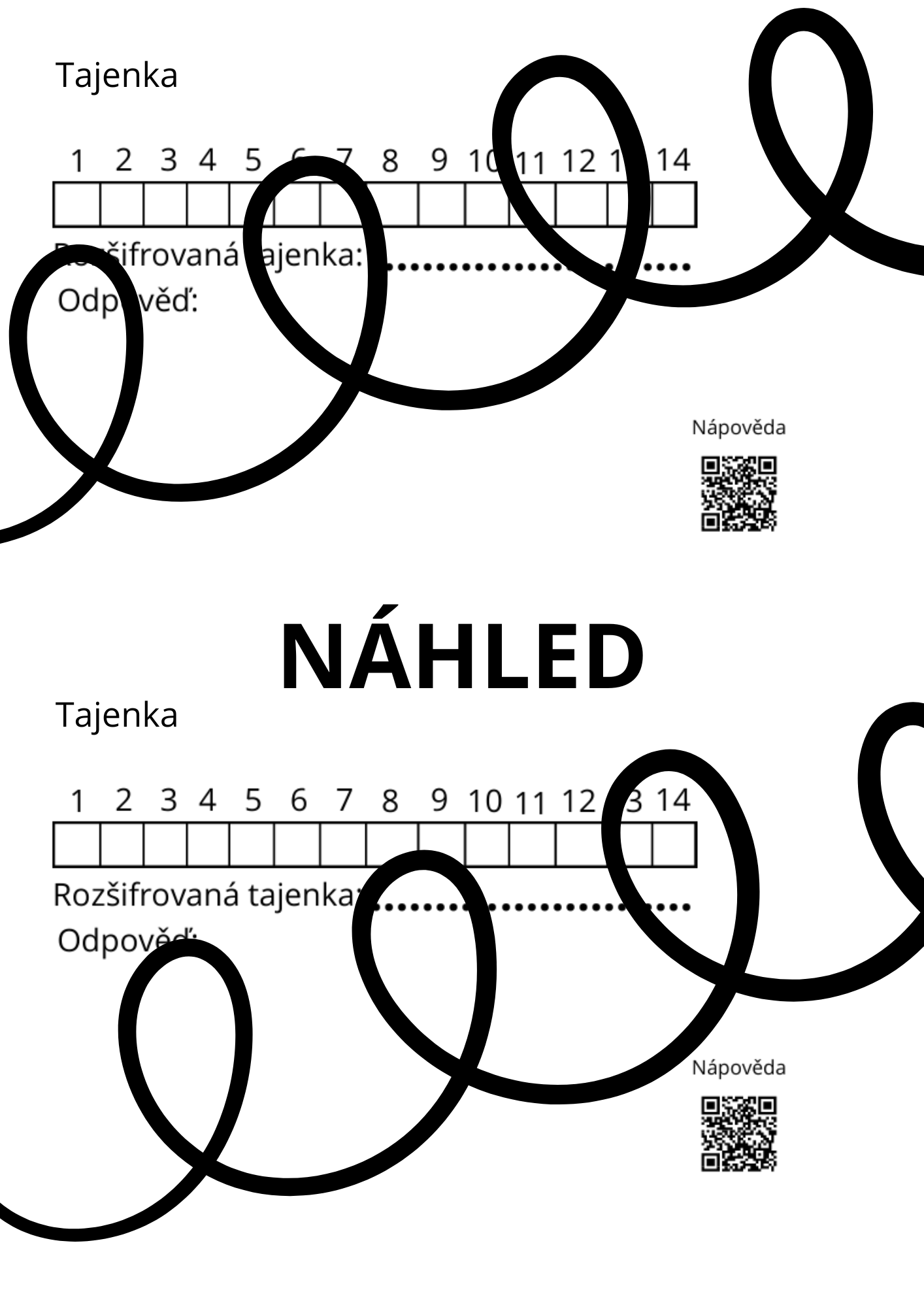 Pracovní arch (tajenku) pro žáky: Arch pro zápis 14 písmen získaných z hledačky. Místo pro rozluštění finální tajenky a pro finální odpověď. Arch obsahuje QR kód s nápovědou (odkaz na edukee.cz).