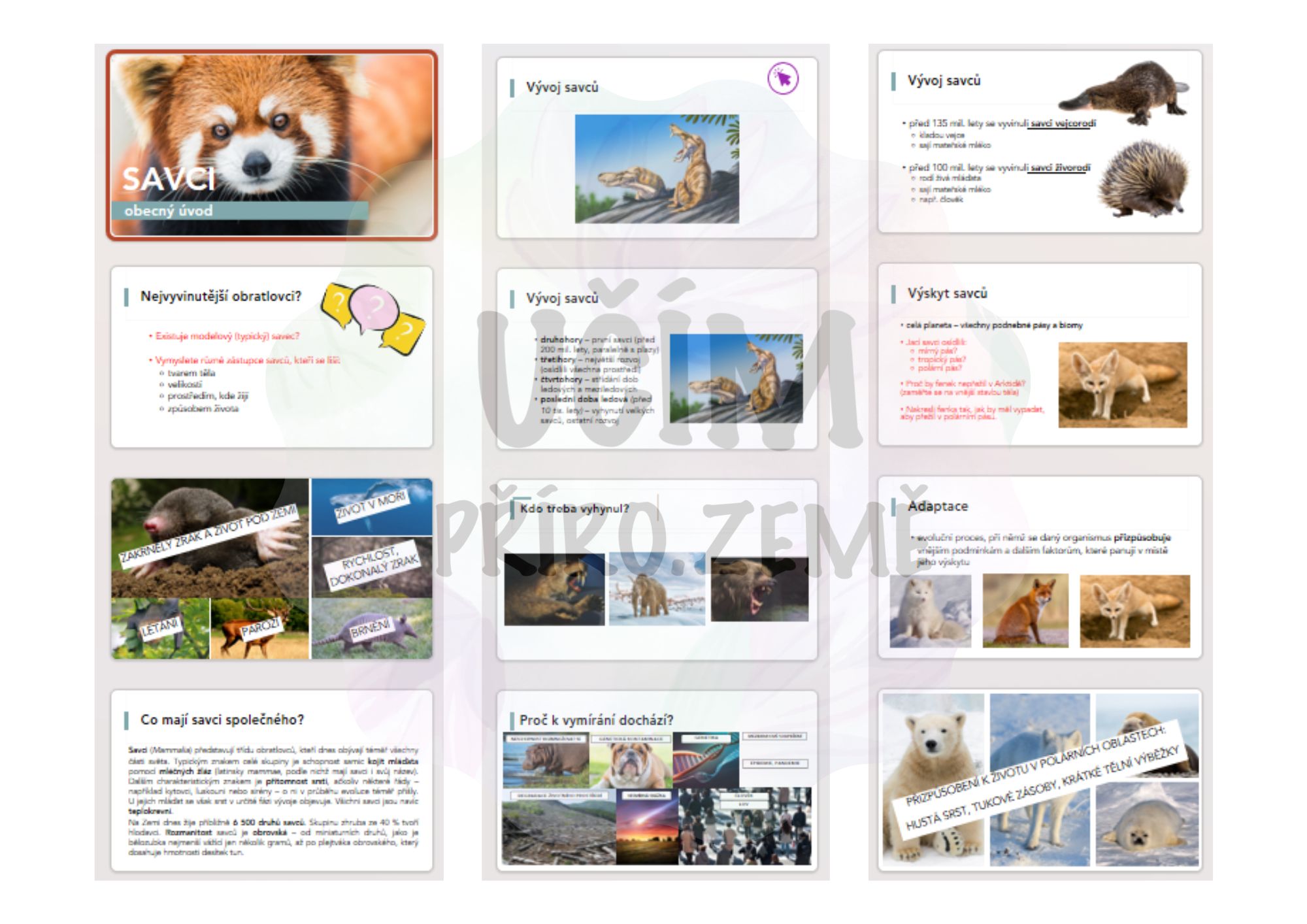 Materiál nabízí kompletní sadu podkladů pro tři vyučovací hodiny zaměřené na úvod do tématu savců. Žáci se seznámí se základními znaky savců, jejich vývojem, výskytem a přizpůsobením na různá prostředí. Součástí je také téma přizpůsobení stavby těla, vývoje mláďat a příčiny vymírání druhů. Materiál je určen pro 2. stupeň ZŠ (zejména 8. ročník) a lze jej využít jak pro výklad, tak pro aktivní zapojení žáků a opakování učiva.