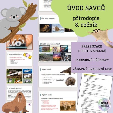 Hledáte ucelený a přehledný materiál, se kterým bez stresu odučíte úvod do tématu savců? Využijte hotové prezentace, přípravy a pracovní list, které vám ušetří čas a zároveň zaujmou žáky. Materiál kombinuje výklad i aktivní práci žáků.