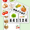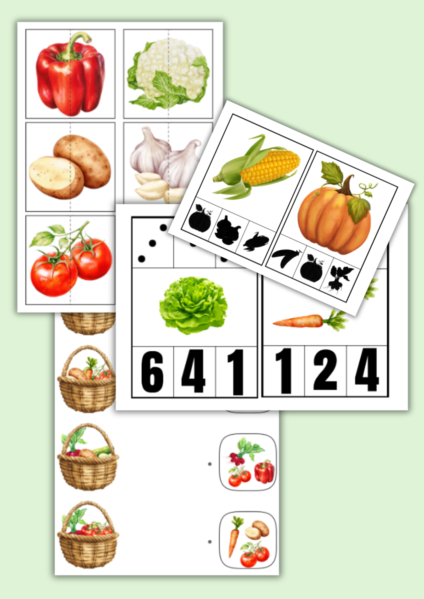 🔹 4 karty kolíčkování zaměřené na předmatematickou gramotnost – dítě určuje počet zeleniny a přiřazuje k němu správné číslo nebo počet puntíků,
