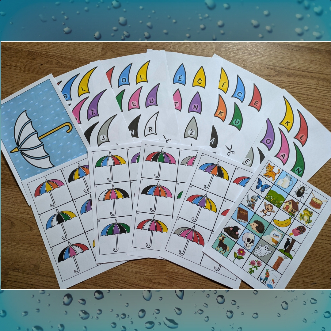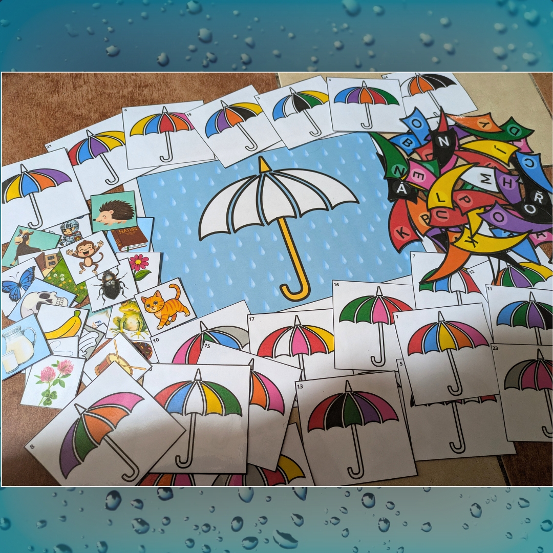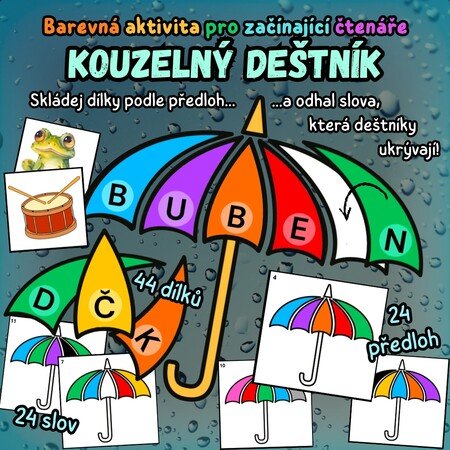 Když děti správně poskládají všechny dílky na podložku podle předlohy, mohou odhalit, jaké slovo deštník ukrývá! Poskládat si mohou celkem 24 deštníků a odhalit tak 24 slov.