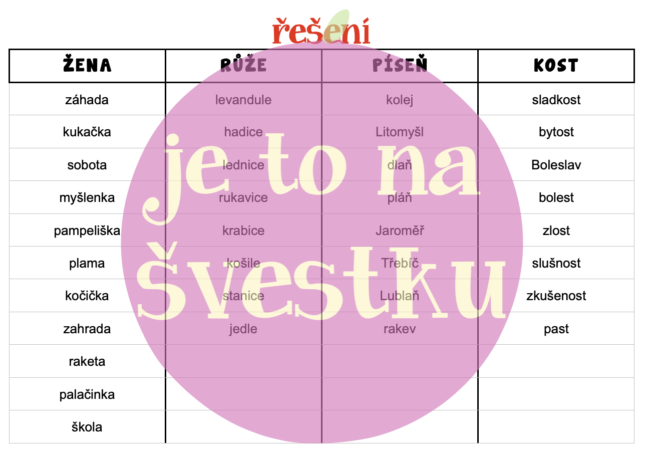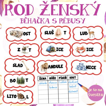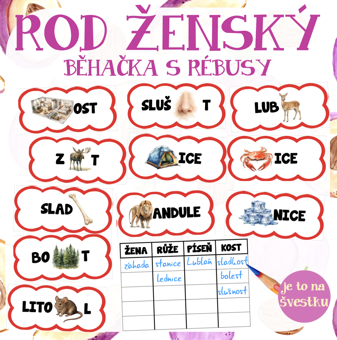Materiál obsahuje 36 rébusů, které žáci řeší a po správném určení slova ho přiřazují ke vzorům rodu ženského. Kartičky s rébusy rozmístíte po třídě, vytisknete žákům tabulku na poslední stránce v souboru a ti chodí, luští a slova zapisují do tabulky. Slov je více, než míst v tabulce, takže mají na výběr, která slova si zvolí.