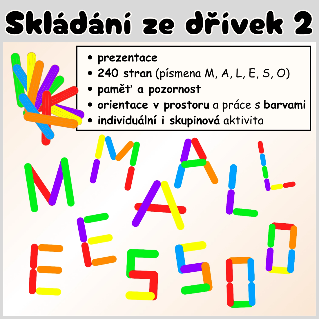 Prezentace obsahuje 240 obrázků z barevných dřívek rozdělených do 6 kategorií podle písmen: M, A, L, E, S, O.