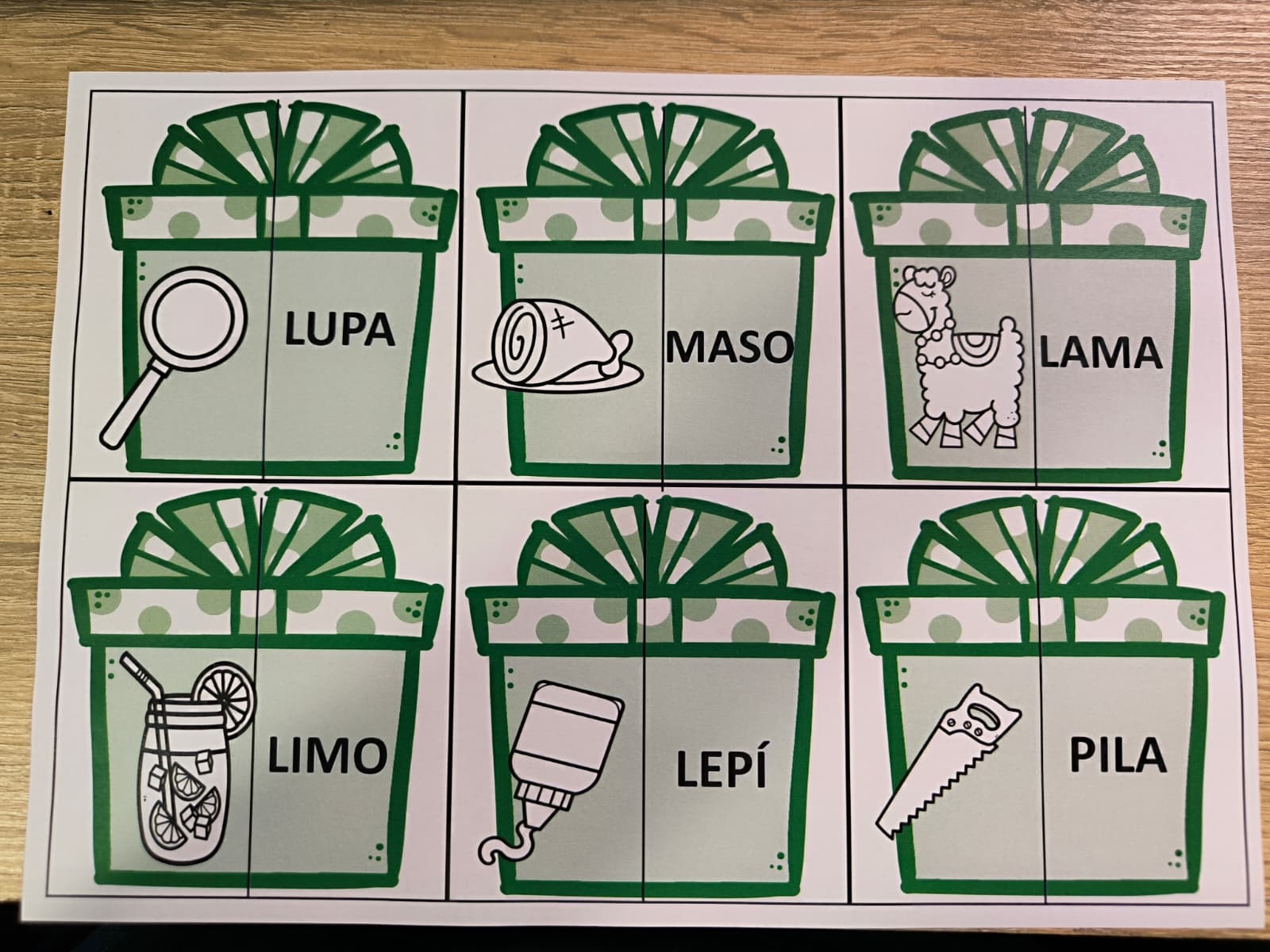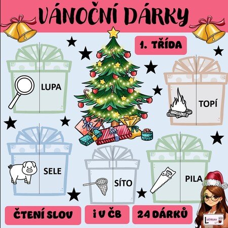 Cílem materiálu je procvičit si první čtení slov s porozuměním. Jedná se o soubor 24 dárků, kde každý dárek se skládá ze slova a obrázku. Žáci mají za úkol slova přečíst a k slovu vždy najít správný obrázek. Hrajeme ve skupinách dle barevného rozlišení. Rozsah písmen odpovídá cca do prosince 1. třídy – M, L, S, P, T a samohlásky. V materiálu najdete i černobílou variantu, kterou lze využít i jako omalovánku. Rychlíci mohou slova opisovat či přepisovat do sešitu nebo na mazací tabulku. Černobílou variantu lze vytisknout i na barevné papíry pro snazší rozřazení do skupin.