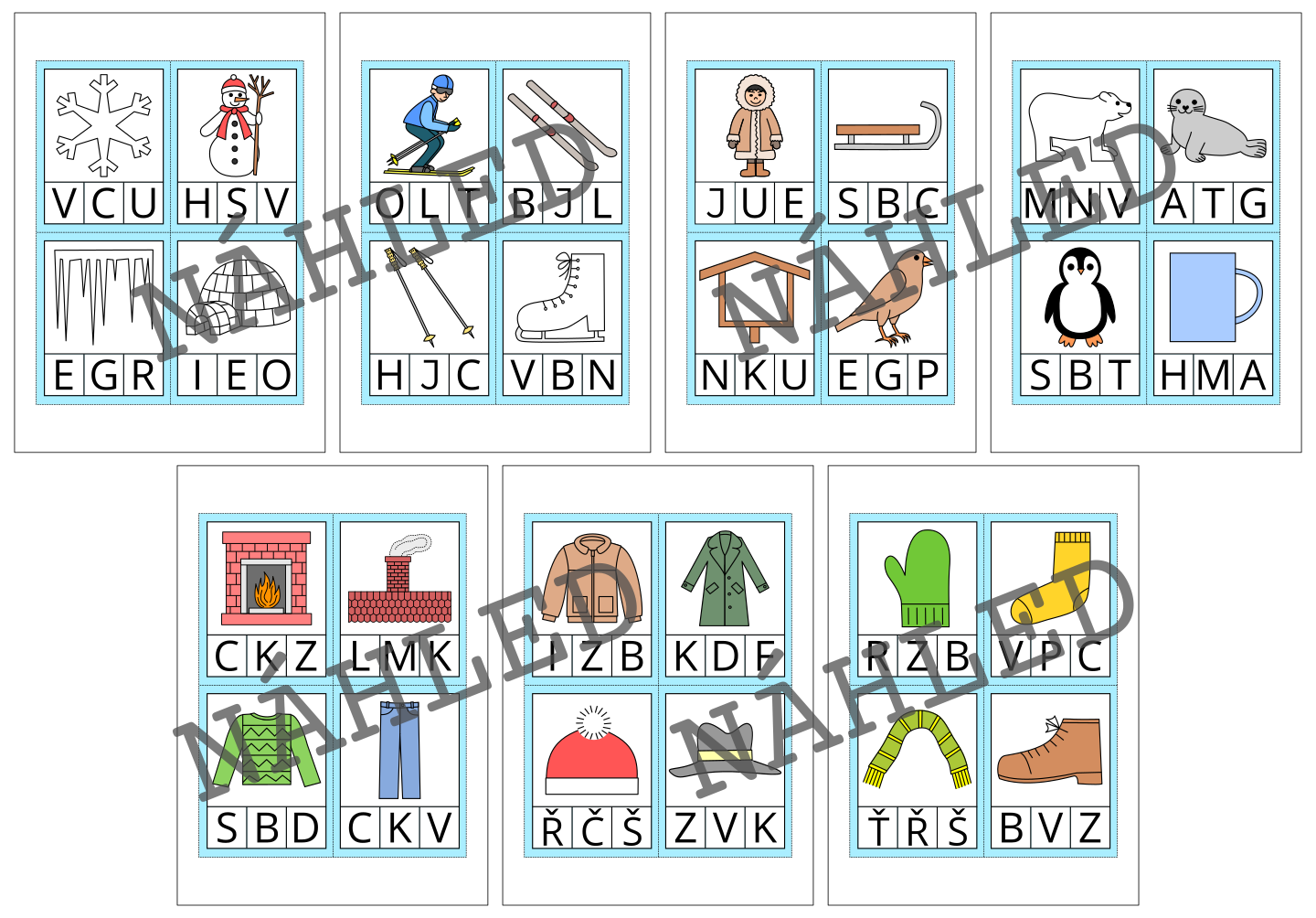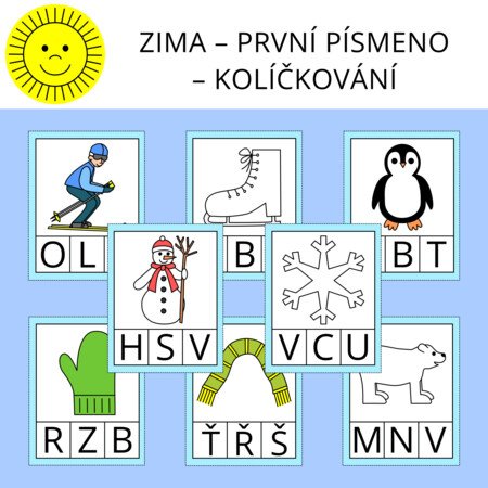 Materiál na určování prvního písmena slov spojených se zimou obsahuje 28 kartiček (1 strana = 4 kartičky). Strany s kartičkami vytiskněte a rozstříhejte. Kartičky můžete zalaminovat. Děti pojmenují obrázek a kolíčkem označí první písmeno slova.