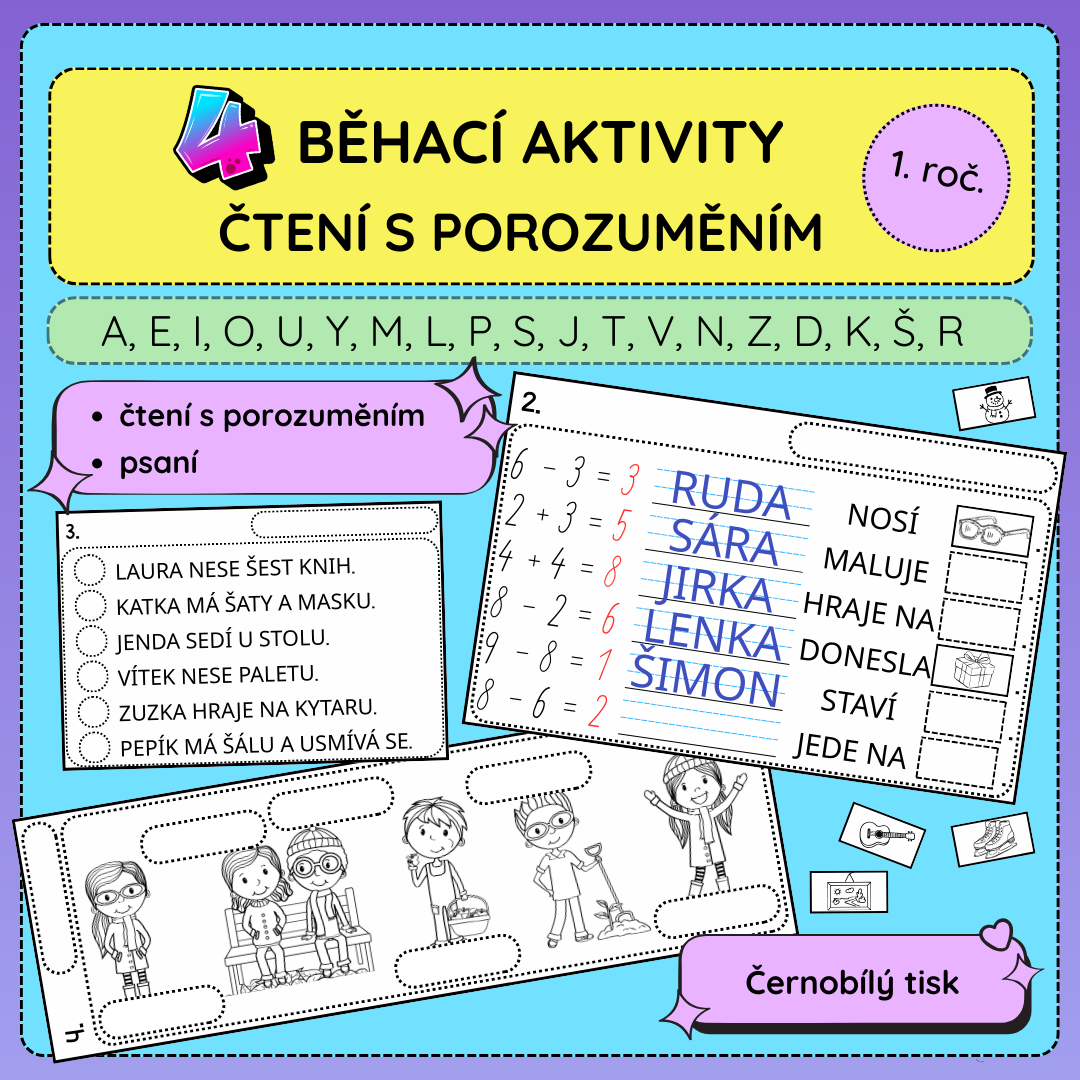 Díky 4 různým běhacím aktivitám podpoříte ve své třídě čtení s porozuměním. Texty obsahují písmena v rozsahu A, E, I, O, U, Y, M, L, P, S, J, T, V, N, Z, D, K, Š, R - Slabikář 1 (Nová škola, s.r.o.)