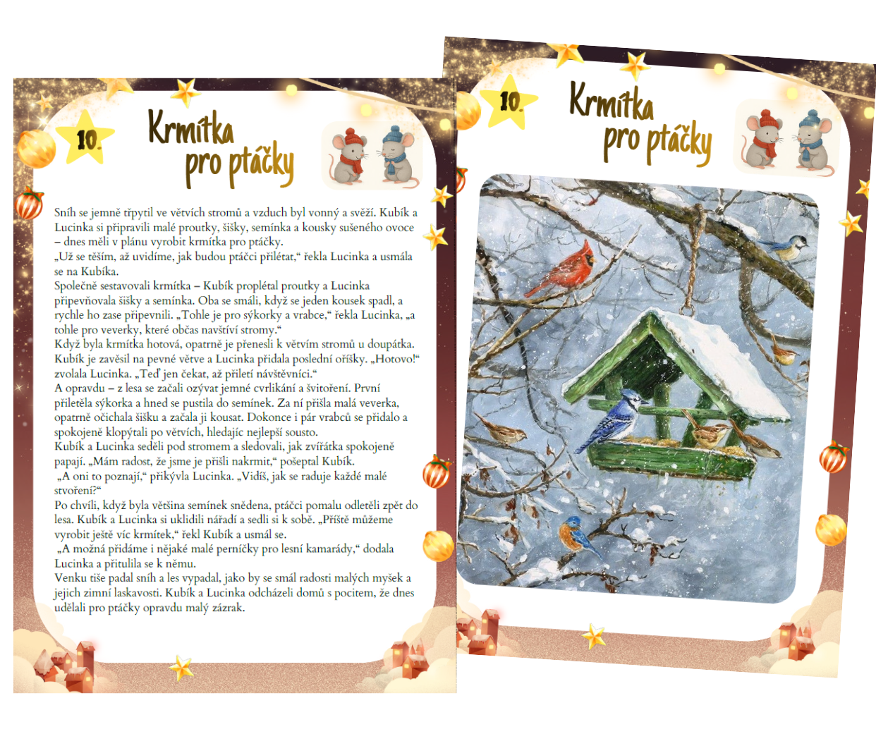 Tento materiál obsahuje 24 zimních a vánočních příběhů o dvou malých myškách, Kubíkovi a Lucince, kteří spolu prožívají kouzelné adventní dobrodružství. Každý příběh je určen na jeden den adventního kalendáře a postupně vede děti celým obdobím Vánoc — od prvního sněhu až po Štědrý den.