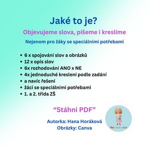 Dobrý den, do rukou se vám dostal pracovní soubor pro nácvik orientace na stránce, plnění úkolů, porozumění čtenému textu, rozvoji slovní zásoby a nácviku čtení a psaní tiskací formou. Pracovní listy vychází ze zkušenosti s výukou žáků se speciálními vzdělávacími potřebami na základní škole podporující děti s mentálním postižením, autismem a kombinovaným postižením. Soubor obsahuje 19 stran, které je potřeba vytisknout a případně zalaminovat. Žáci si mohou obrázky vymalovat, tím získají vlastní pracovní sešit, který je bude motivovat se k úkolům znovu vracet. V tomto souboru najdete seznamovací obrázky k tématu, čtení vět, doplňování chybějících písmen do slov, samostatné psaní slov, osmisměrku, vykreslování obrázků podle pokynu, hádanky z kroužkováním správných odpovědí. Pracovní listy mají děti i dospělé bavit, vést žáky k soustředění, rozvoji paměti a postupné samostatnosti při plnění úkolů. Jednotlivé listy jsou jednoduché a přehledné.