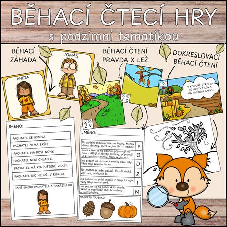 Materiál obsahuje tři varianty běhacího čtení s podzimní tematikou: Běhací záhada, Běhací pravda × lež a Běhací dokreslování. Aktivity rozvíjejí čtení s porozuměním, pozornost i logické myšlení. Vhodné pro žáky 2.–3. ročníku ZŠ.